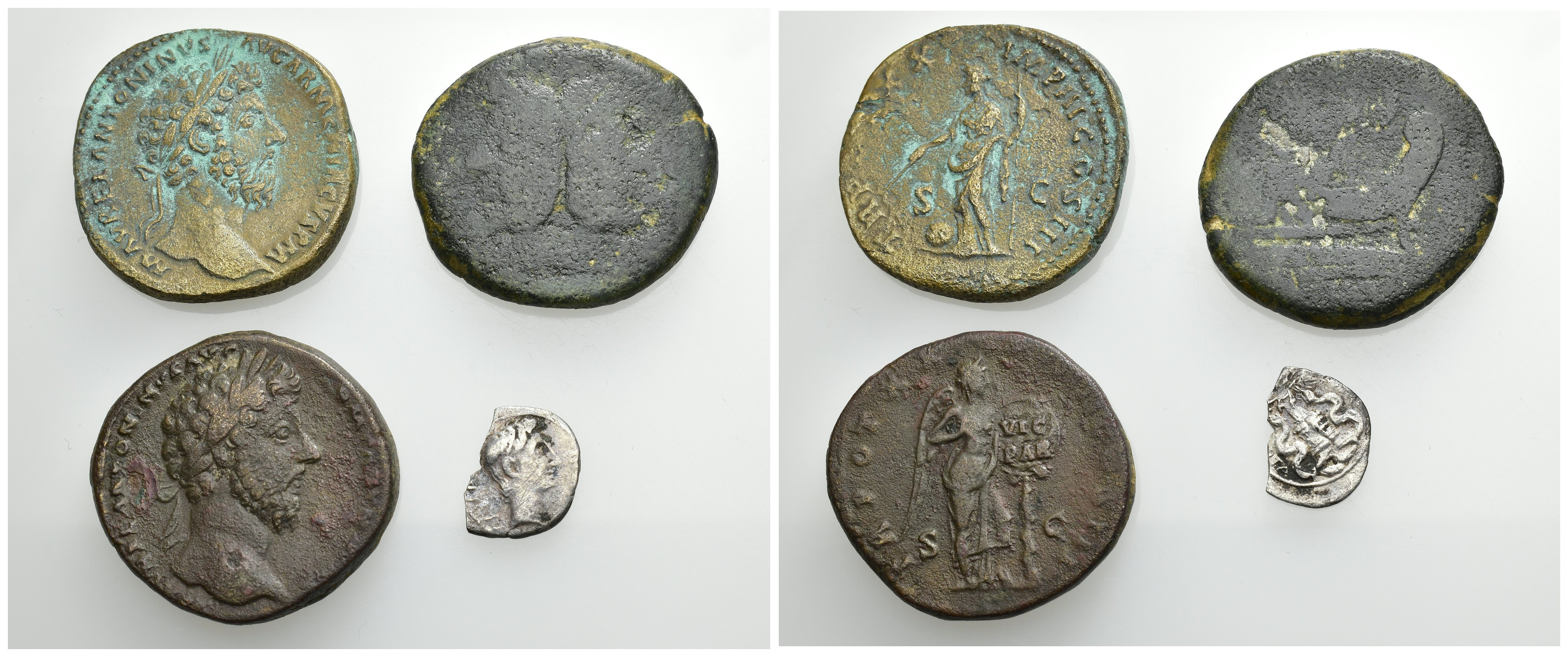 IMPERIO ROMANO. Lote de 4 monedas: 1 as uncial, 2 sestercios de Marco Aurelio y 1 fragmento de quinario. MBC-/RC.