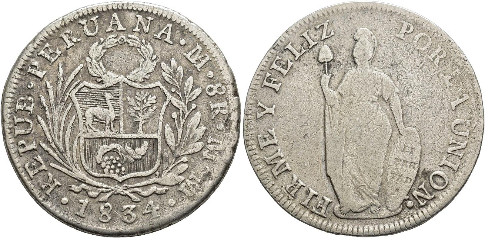 PERÚ. 8 reales. 1834. Lima. MM. AR 25,95 g. 39,7 mm. KM-142.4. Múltiples pequeñas marcas y golpecitos. BC+.