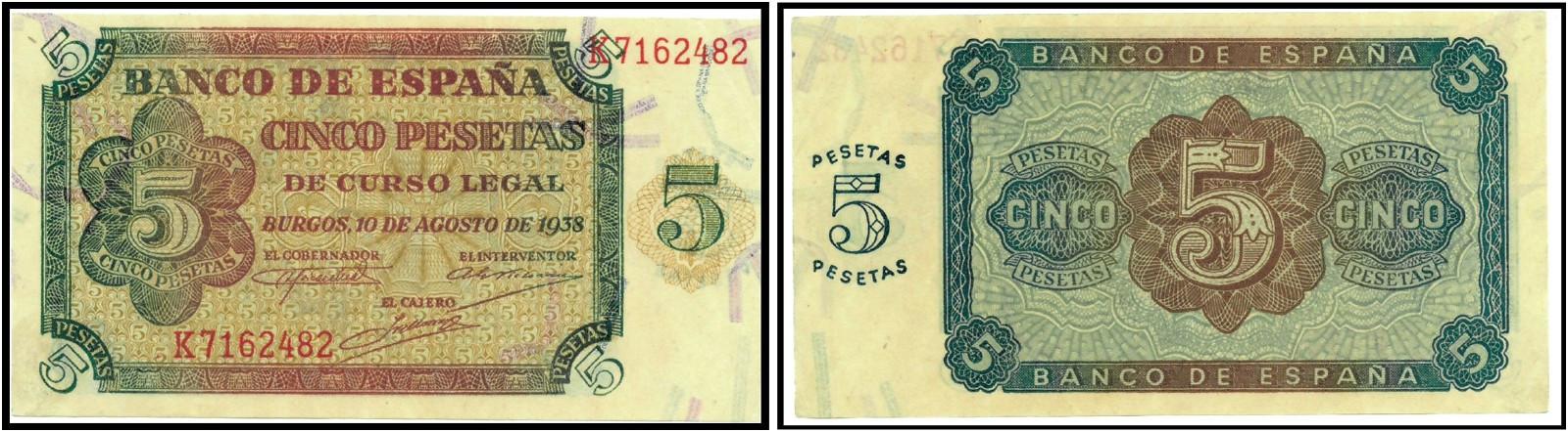 BILLETES. BANCO DE ESPAÑA. 5 pesetas., 10 de agosto de 1938, Burgos. Serie K. ED-D36a. SC.