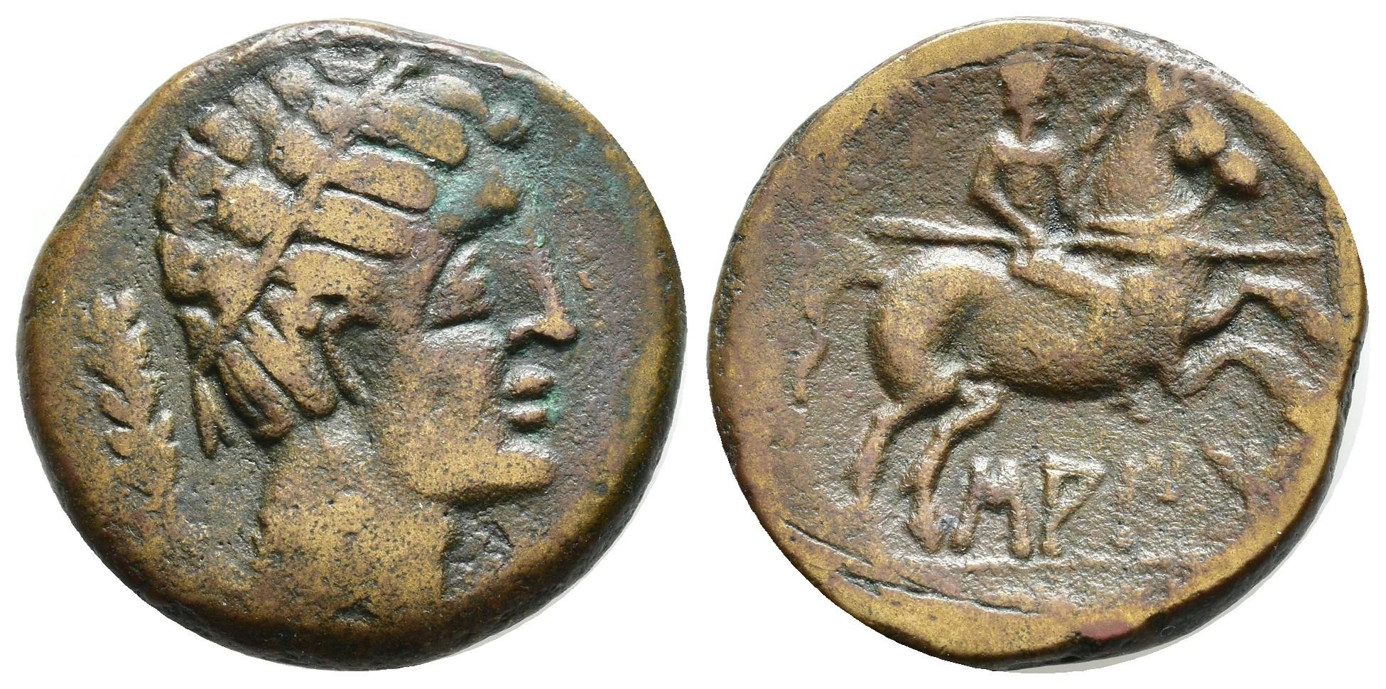 HISPANIA ANTIGUA. SAITI/SAETABI. Unidad. A/ Cabeza masculina diademada a der., detrás palma. R/ Jinete lancero a der., debajo SAITi sobre línea. AE 11,86 g. 26,7 mm. I-2100; ACIP-2031. MBC.
