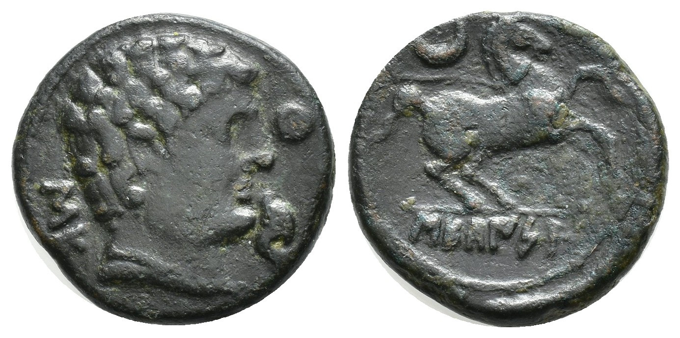 HISPANIA ANTIGUA. SEKAISA. Semis. A/ Cabeza masculina con collar a der., delante delfín y Ku, detrás SE. R/ Caballo con rienda suelta a der., encima creciente, en exergo SEKaISA. AE 4,62 g. 18,5 mm. I-2147; ACIP-1545. Pátina verde oscuro. MBC. Rara.