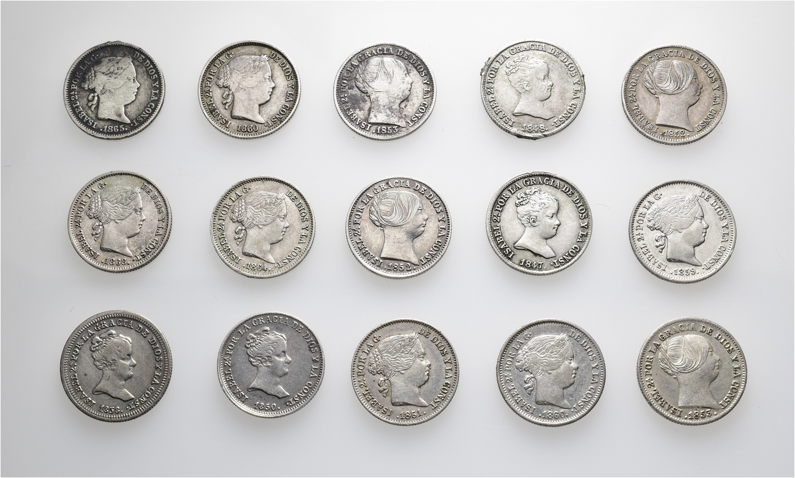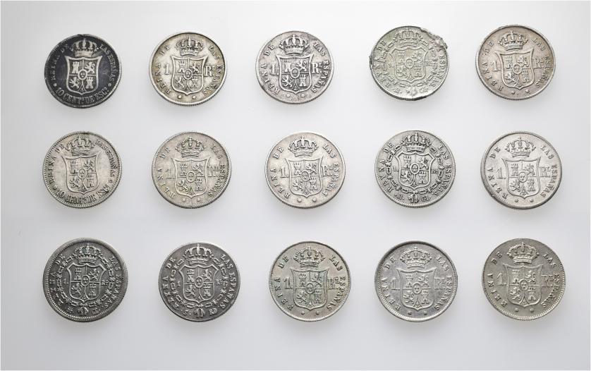 ISABEL II. Lote de 15 piezas diferentes: real Barcelona 1853 y 1861; Madrid 1838, 1847, 1848, 1852, 1853, 1859, 1860 y 1864; Sevilla 1850, 1852 y 1860; 10 céntimos de escudo Madrid 1868 y Sevilla 1865. MBC-/EBC.