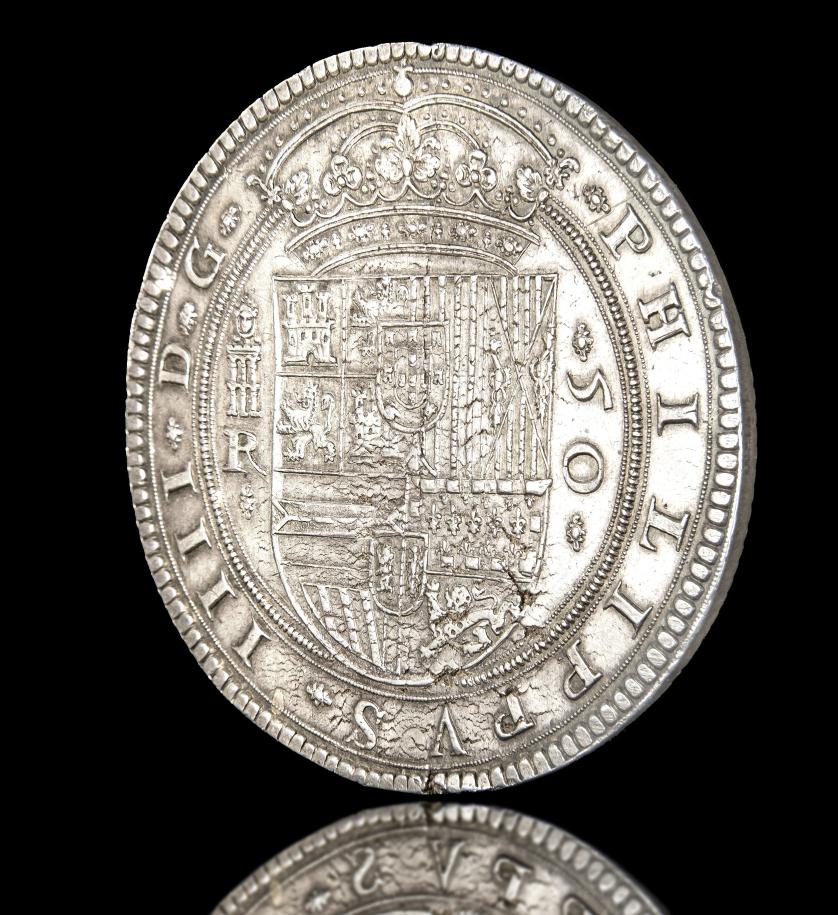 NumismáticaThe exceptional nature of these issues at the Real Ingenio in Segovia and the specific need of obtaining royal licenses to mint them is well known, with one of the main groups applying for these licenses being the Sevillian silver merchants. However, in 1633, there is an unusual case where an "open" license is issued in the name of the assayer of the Mint, Rafael Salván. This allowed him to work for any private individual without the need for the metal owners to request authorisation or declare the origin of their gold, as this license does not specifically mention silver minting. Despite this, silver mintings did take place, as we know that merchants Lope de Ulloque and Pedro de Arambaru (regulars in the issues at the Mint since 1621) minted 11,780 kilos of silver in Segovia that year, and part of it was made into pieces of 50 reales. The issuing of cincuentines of this year has another unique characteristic: there are three variants. The first has a small assayer’s mark and a mint mark of six arches (of which only 4 pieces are known), while the second and third have a large assayer’s mark and a mint mark of four arches (with a total of 9 pieces between both variants). These last two differ in that one of them has a hollow cross on the reverse and the other has a solid cross, which is the feature present in the piece being featured in this auction.