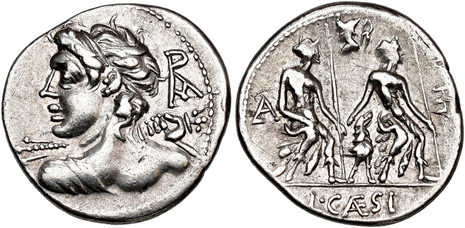ROMAN REPUBLIC. CAESIA. L.Caesius. Denarius. Rome (112-111 BC). Bust of Apollo seen from behind with thunderbolt, monogram behind. Rev. Seated Lares right, dog in the middle, bust of Vulcan with tongs above; LA TRE/L CAESI. AR 3,93 g. 20.4 mm. CRAW-298. 1; FFC-222. Minor marks and light weak strike on reverse. EF-.