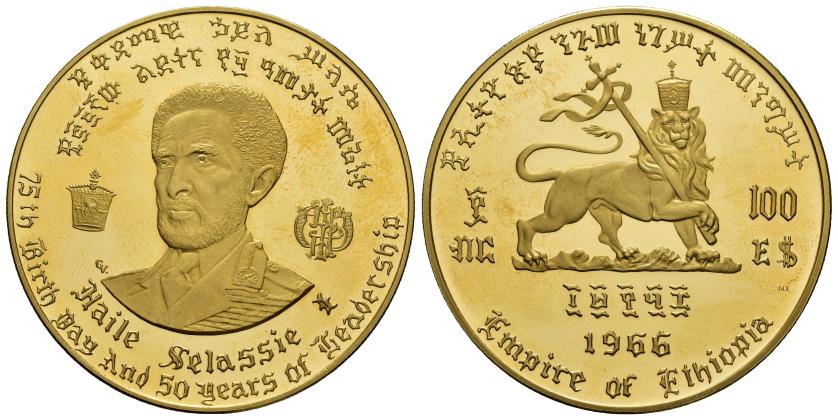 WORLD COINS. ETHIOPIA. 10, 20, 50, 100 and 200 dollars, 1966. Haile Selassie. AU 4.1 g, 8.1 g, 20.2 g, 40.2 and 80.1 g. Total: 152.7 g. KM-38, 39, 40, 41 and 42. In a case and with certificate. Proof.