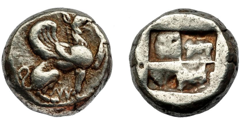 GRECIA ANTIGUA. JONIA. Teos. Estátera. A/ Grifo a der. con pata delantera levantada; entre las patas NV. R/ Cuadrado incuso. AR 11,91 g. 18,3 mm. COP-1436 vte. SBG-no. MBC.