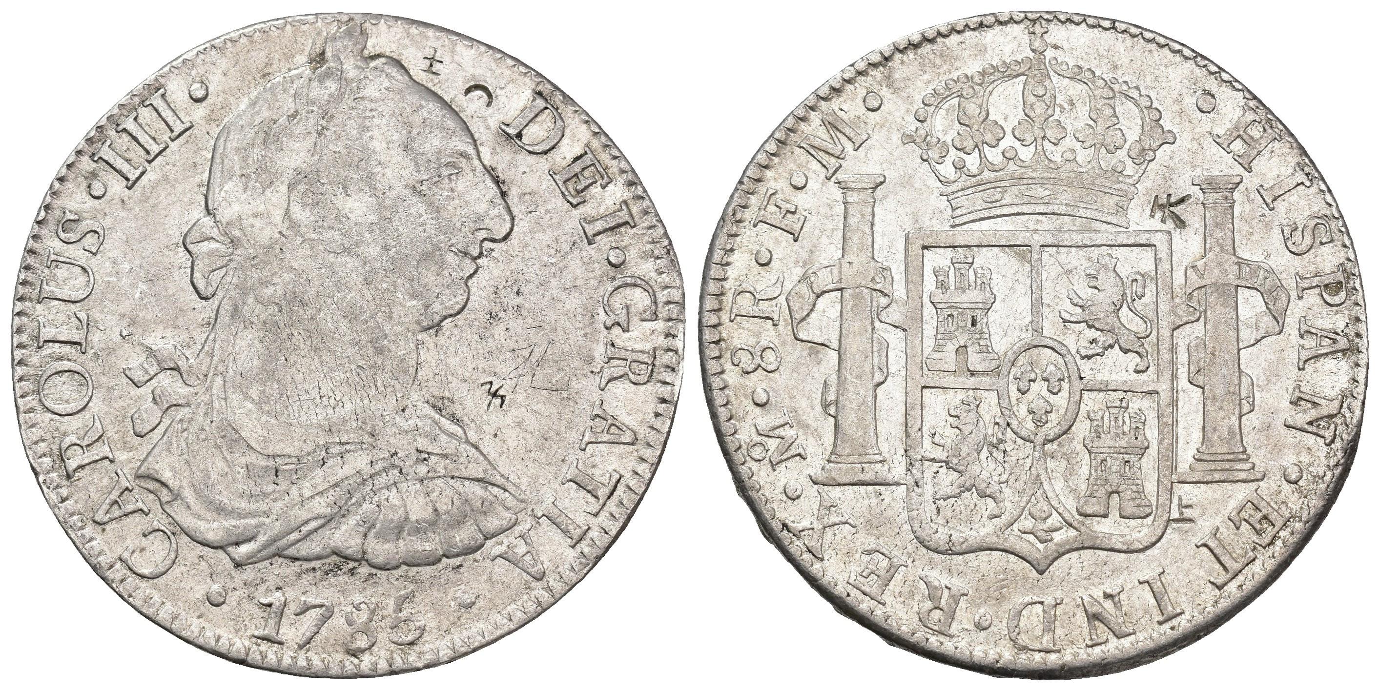 CARLOS III. 8 reales. 1785. México. FM. AR 26,83 g. 37,6 mm. VI-950; AC-1127. Resellos orientales. MBC/MBC+.