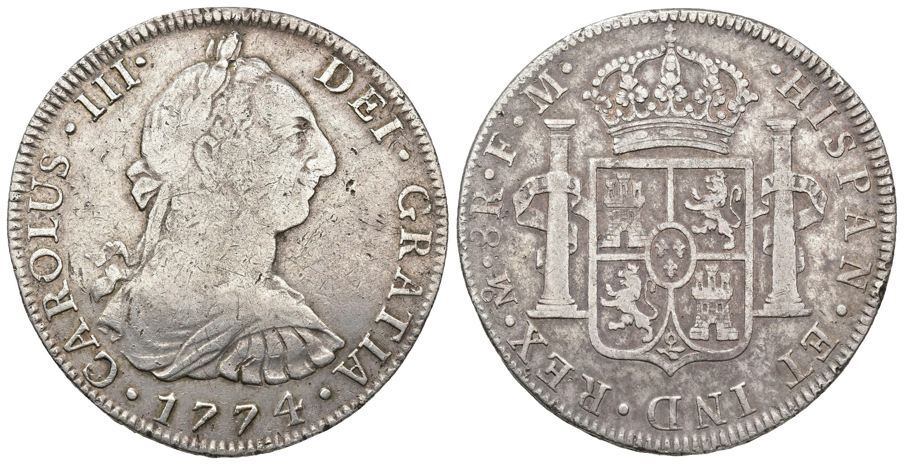 CARLOS III. 8 reales. 1774. México. FM. AR 26,67 g. 38,5 mm. VI-935; AC-1108. MBC-.