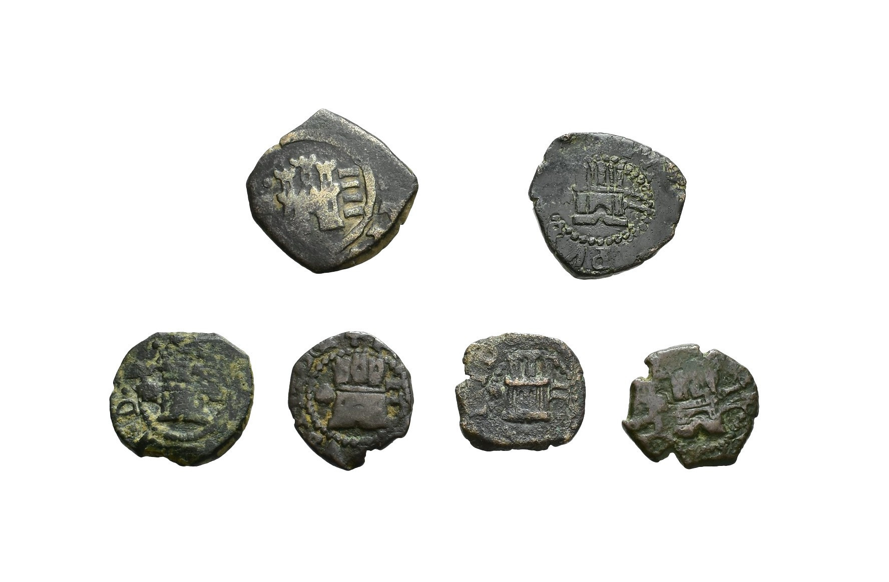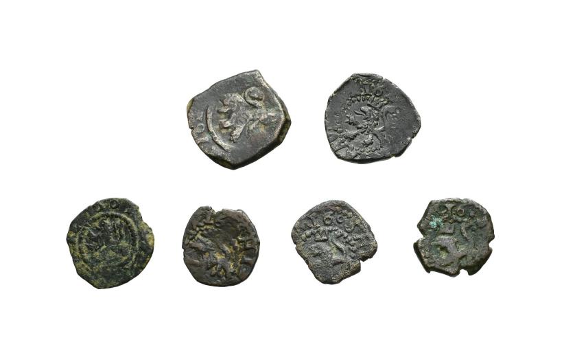 FELIPE III. Lote de 6 piezas: 5 maravedís Coruña 1604, 1605 (2), 1606 (dudosa) y 161-, y 4 maravedís sin fecha visible. Orol-MO.374, 375, 376, 378, 390 y 396. Muy interesante. RC/MBC-.