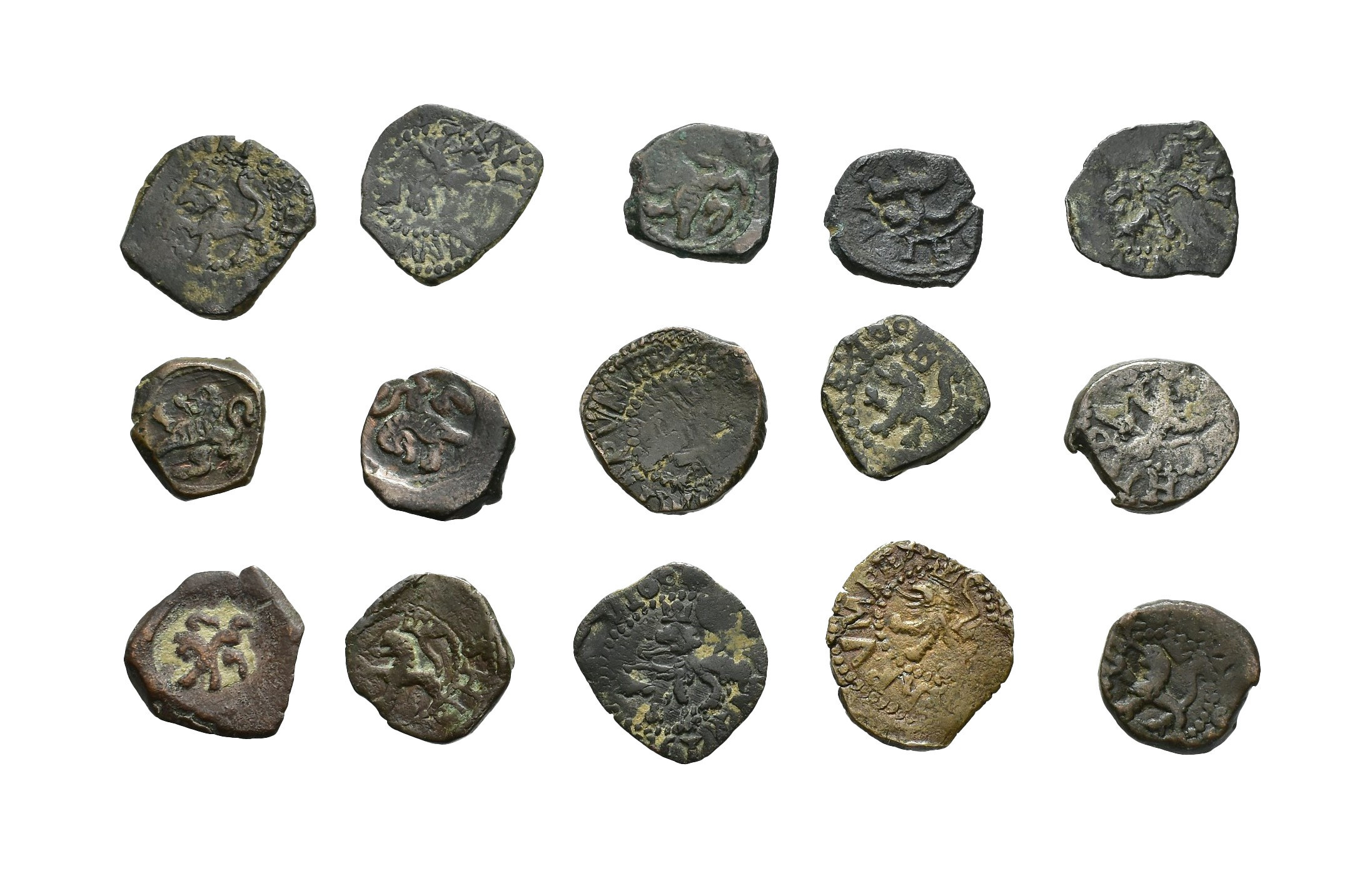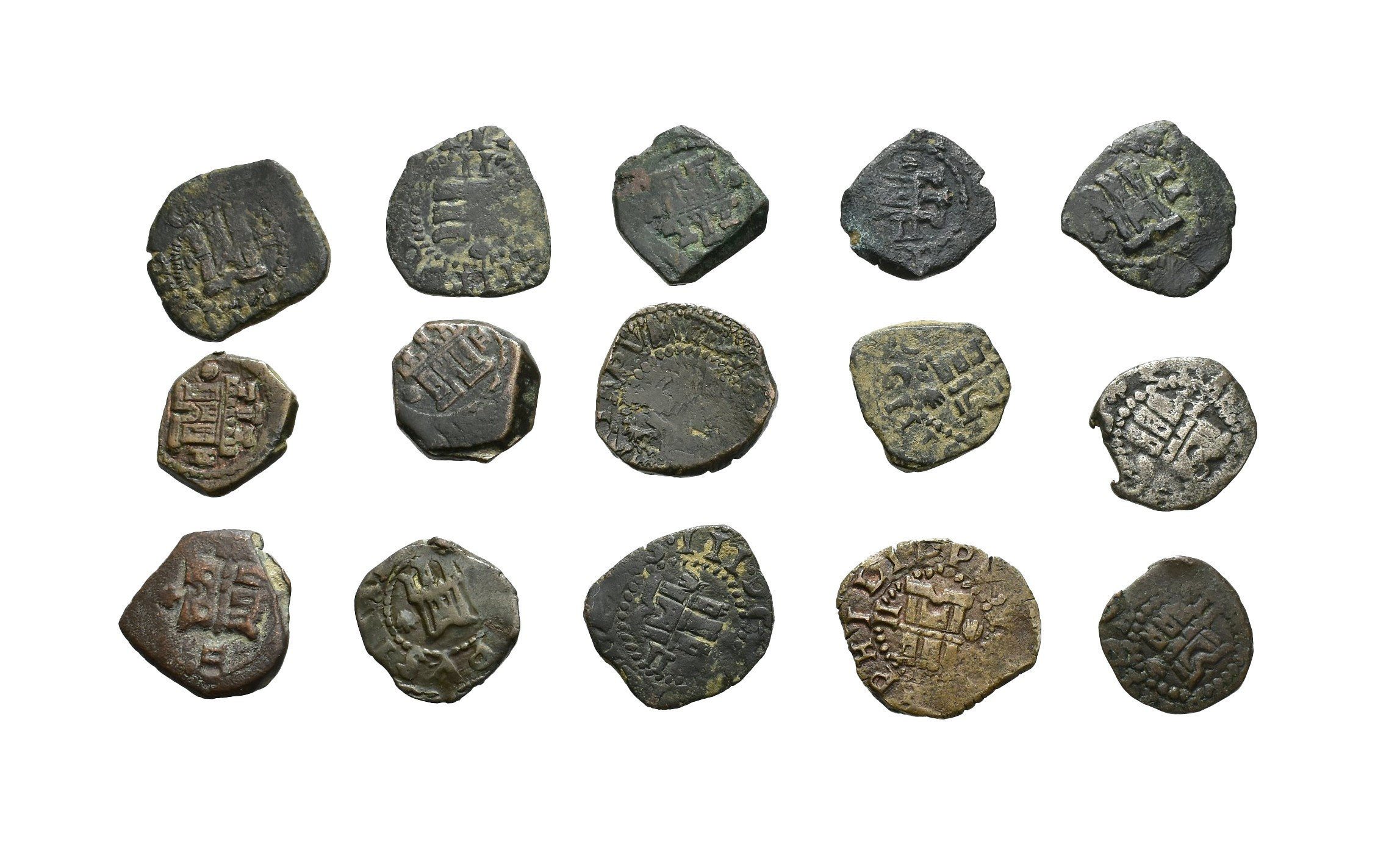 FELIPE III. Lote de 15 piezas de 2 maravedís a martillo. Felipe III (12), Felipe IV (3), Coruña, sin fecha visible. Orol-MO.379, 380, 381, 382, 383, 384, 385, 386, 387, 388, 403, 404, 405 y dos sin ilustrar. RC/MBC.