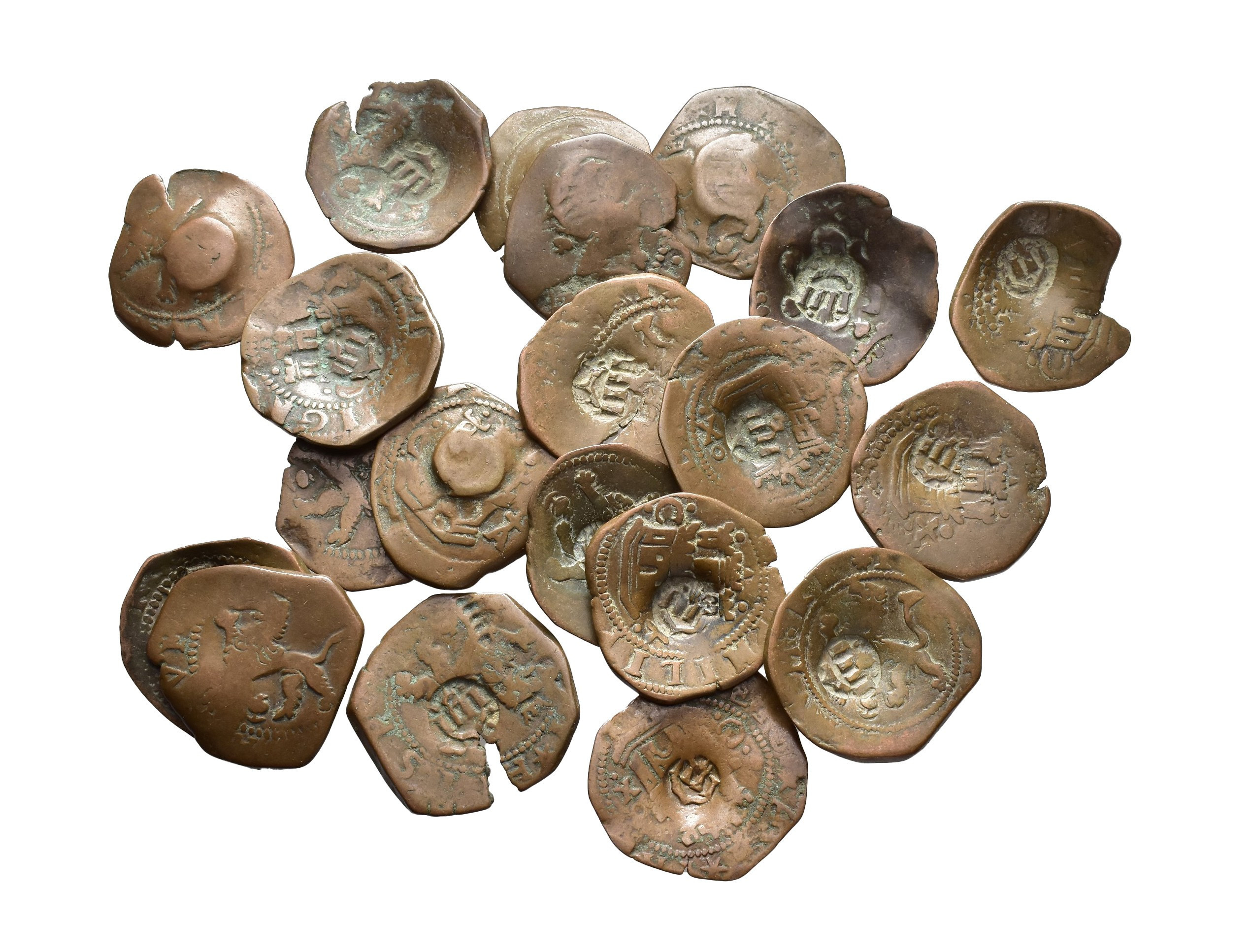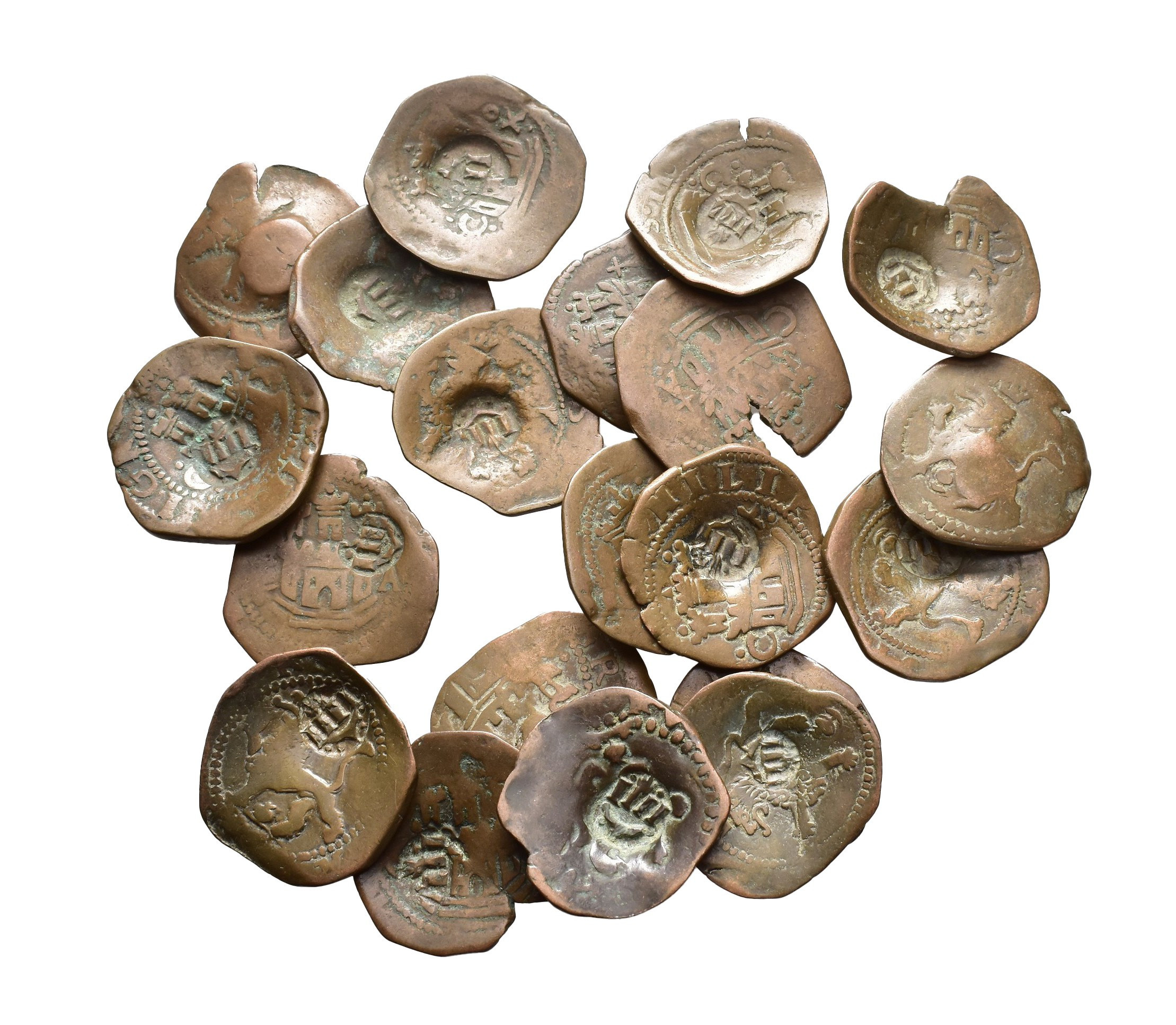 FELIPE III. Lote de 20 cobres a martillo de Felipe II con resello de IIII maravedís Coruña (1603). Orol-MO.392. Los resellos MBC.