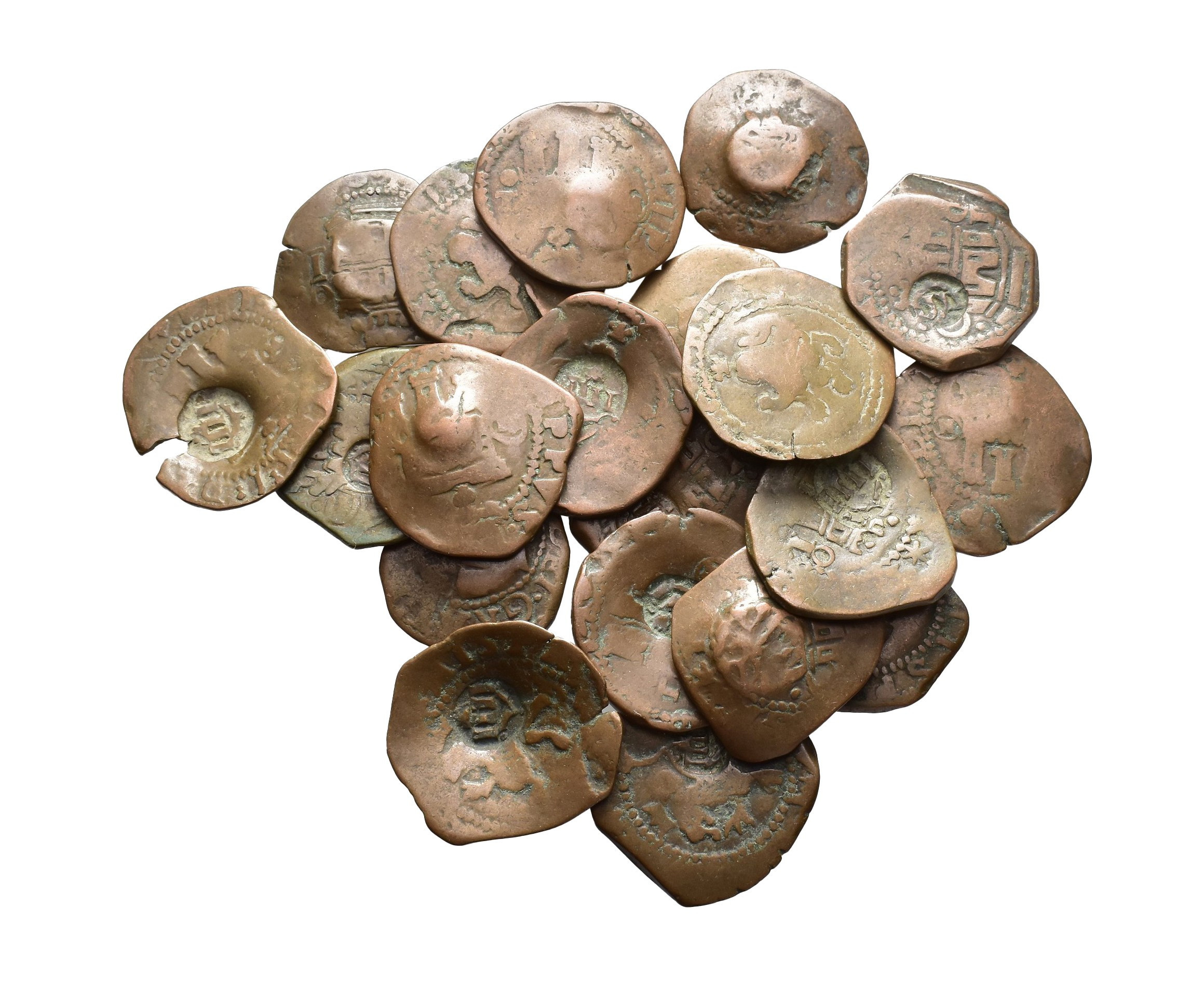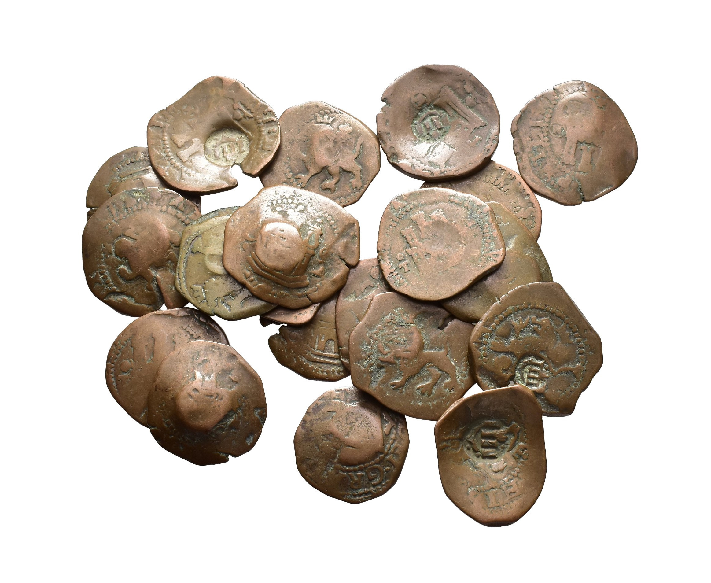 FELIPE III. Lote de 20 cobres a martillo de Felipe II con resello de IIII maravedís Coruña (1603). Orol-MO.392. Los resellos MBC.