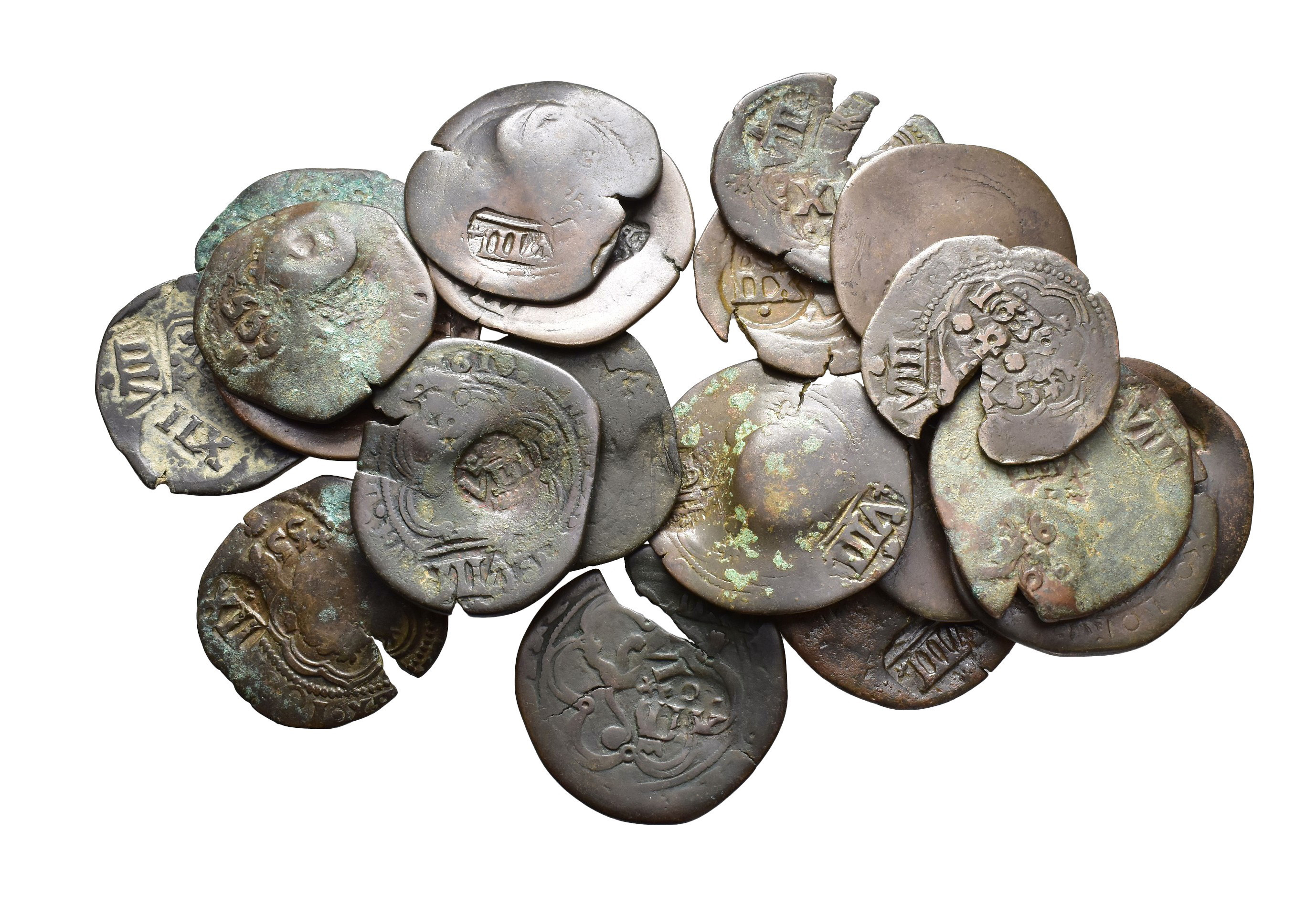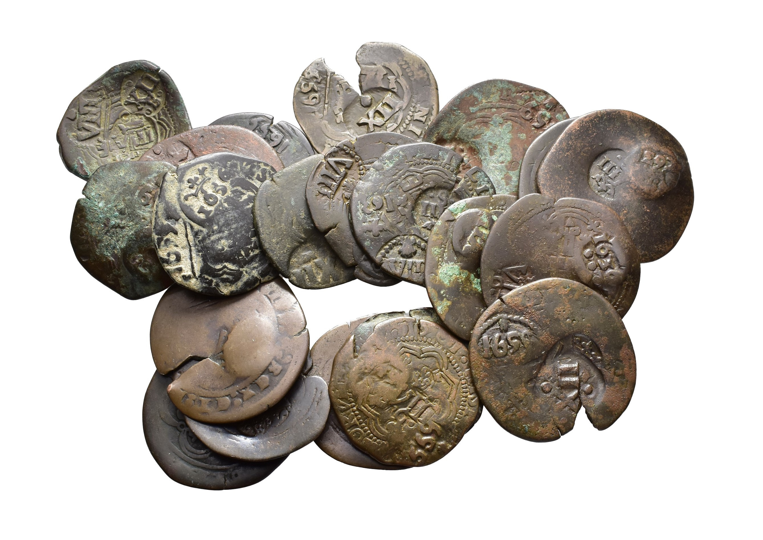 FELIPE III. Lote de 21 cobres a martillo con resello VIII de 1655 Coruña, con venera en valor y fecha. Alguna con otros resellos. Orol-MO.409. Los resellos BC+/MBC.