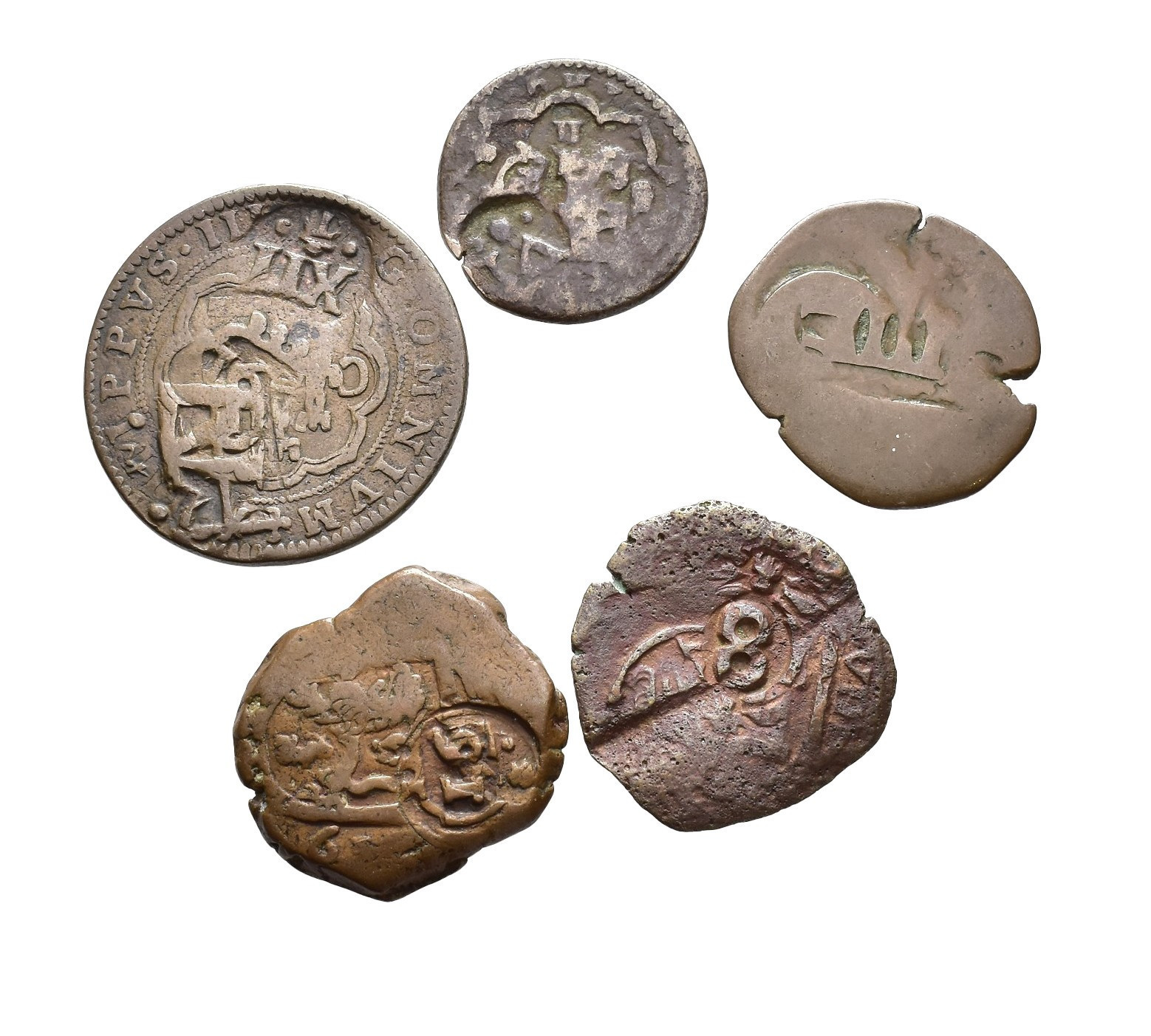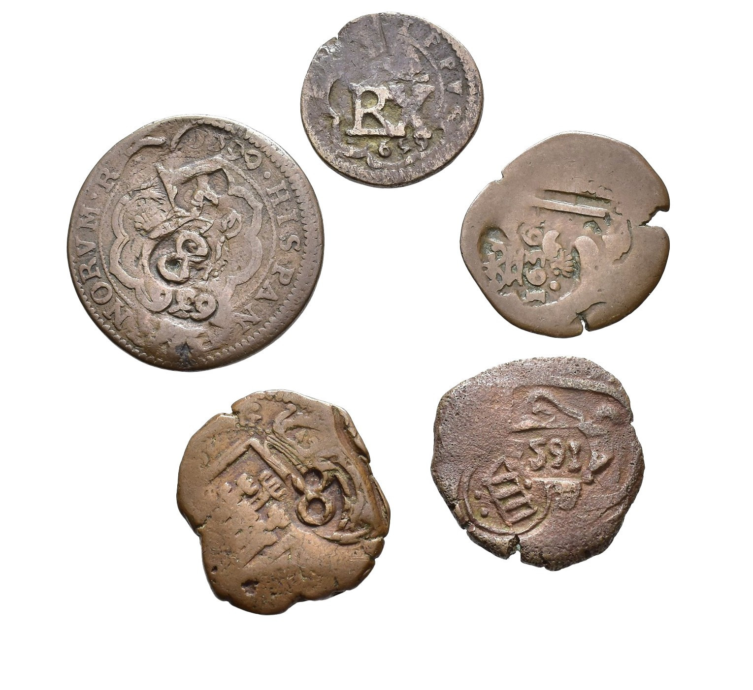 FELIPE III. Lote de 5 resellos 1636-1652, Coruña: XII maravedís con venera vajo valor,1636; VI maravedís con venera bajo fecha 1636 (pág. 121), VI maravedís con venera bajo valor sobre II maravedís 1659 Madrid; 8 maravedís con venera bajo valor 1652; 8 maravedís con venera bajo fecha (16--). Orol-no. Los resellos MBC-/MBC. Muy interesante.