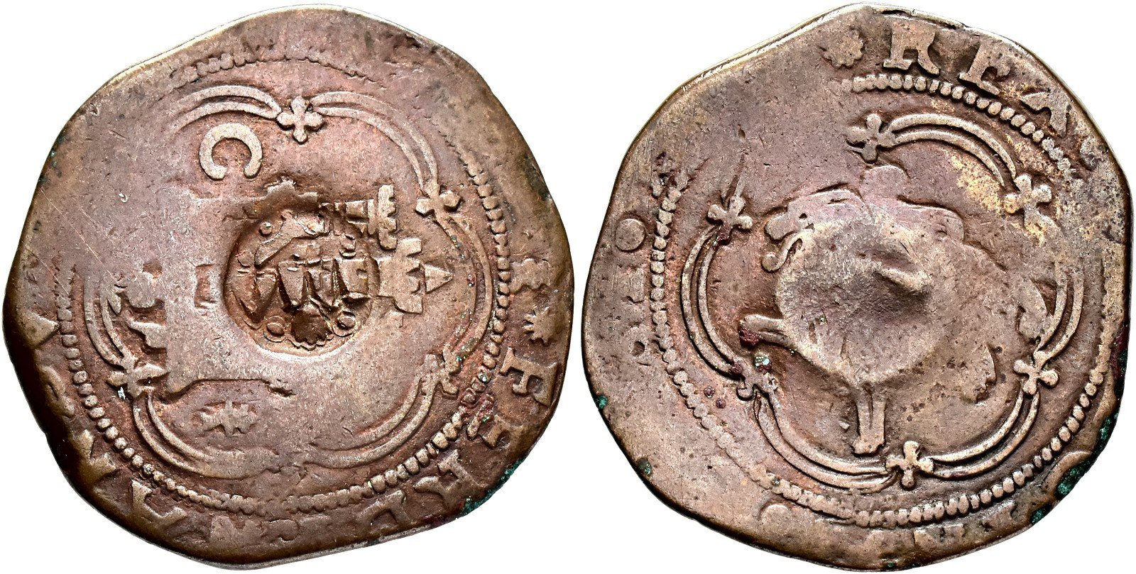 FELIPE III. Sobre 4 mrs. Reyes Católicos Cuenca, resello VIII maravedís Coruña (1603). RS-54. El resello MBC. Escasa.