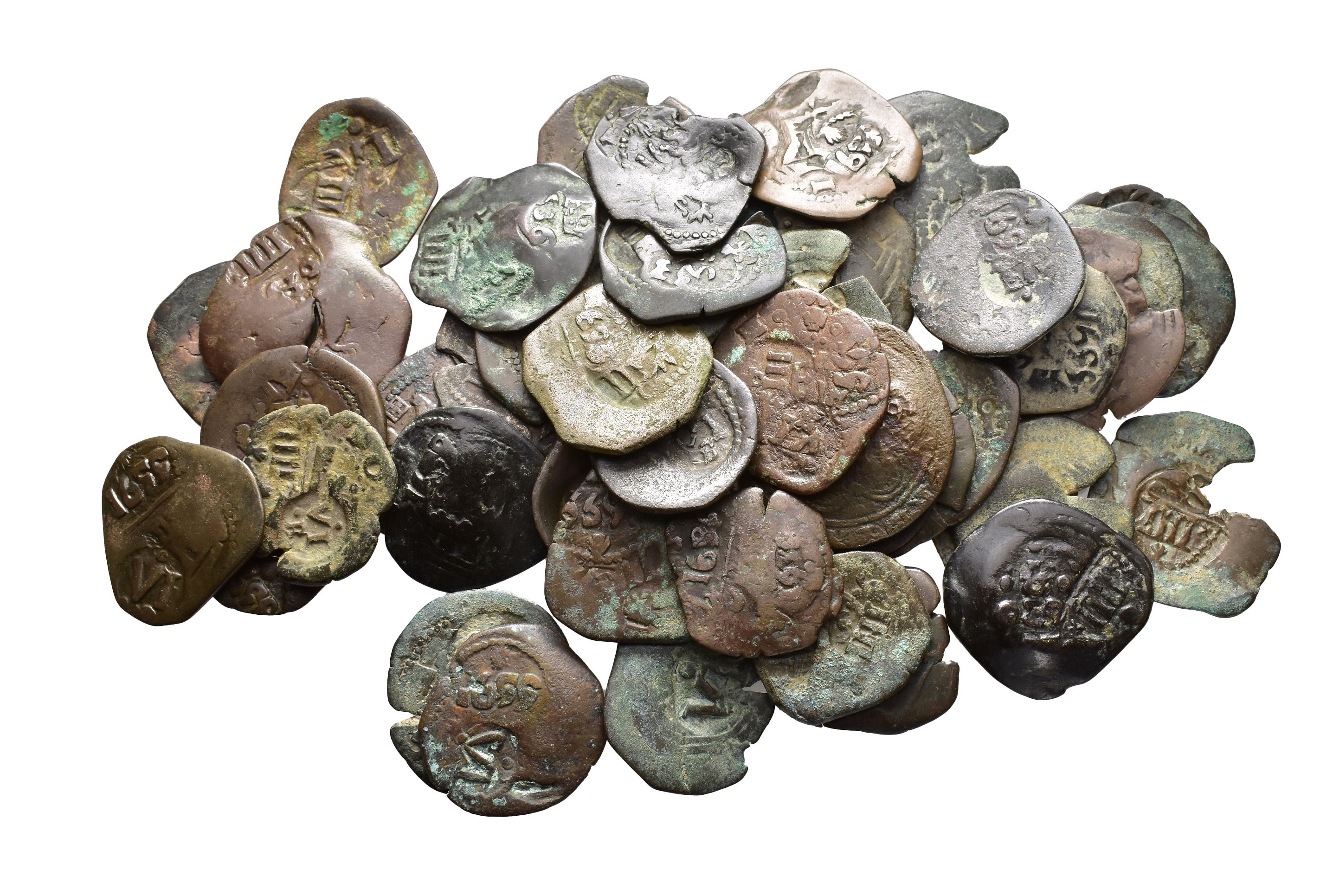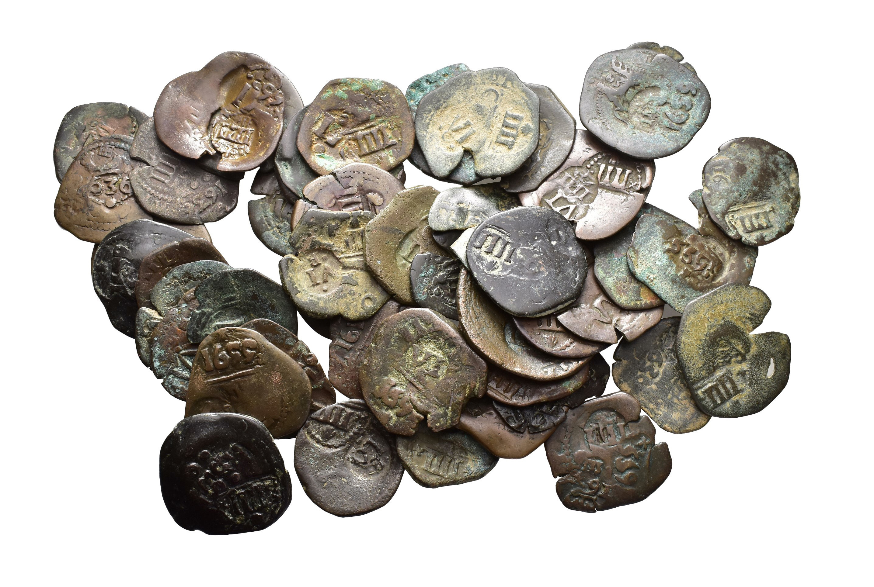 FELIPE IV. Lote de 49 cobres a martillo con resello IIII maravedís 1655 Coruña con múltiples resellos. Los resellos BC/MBC.
