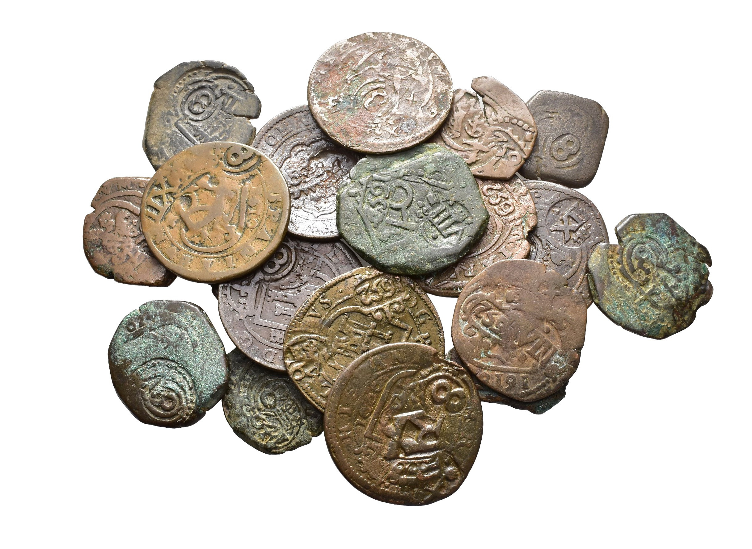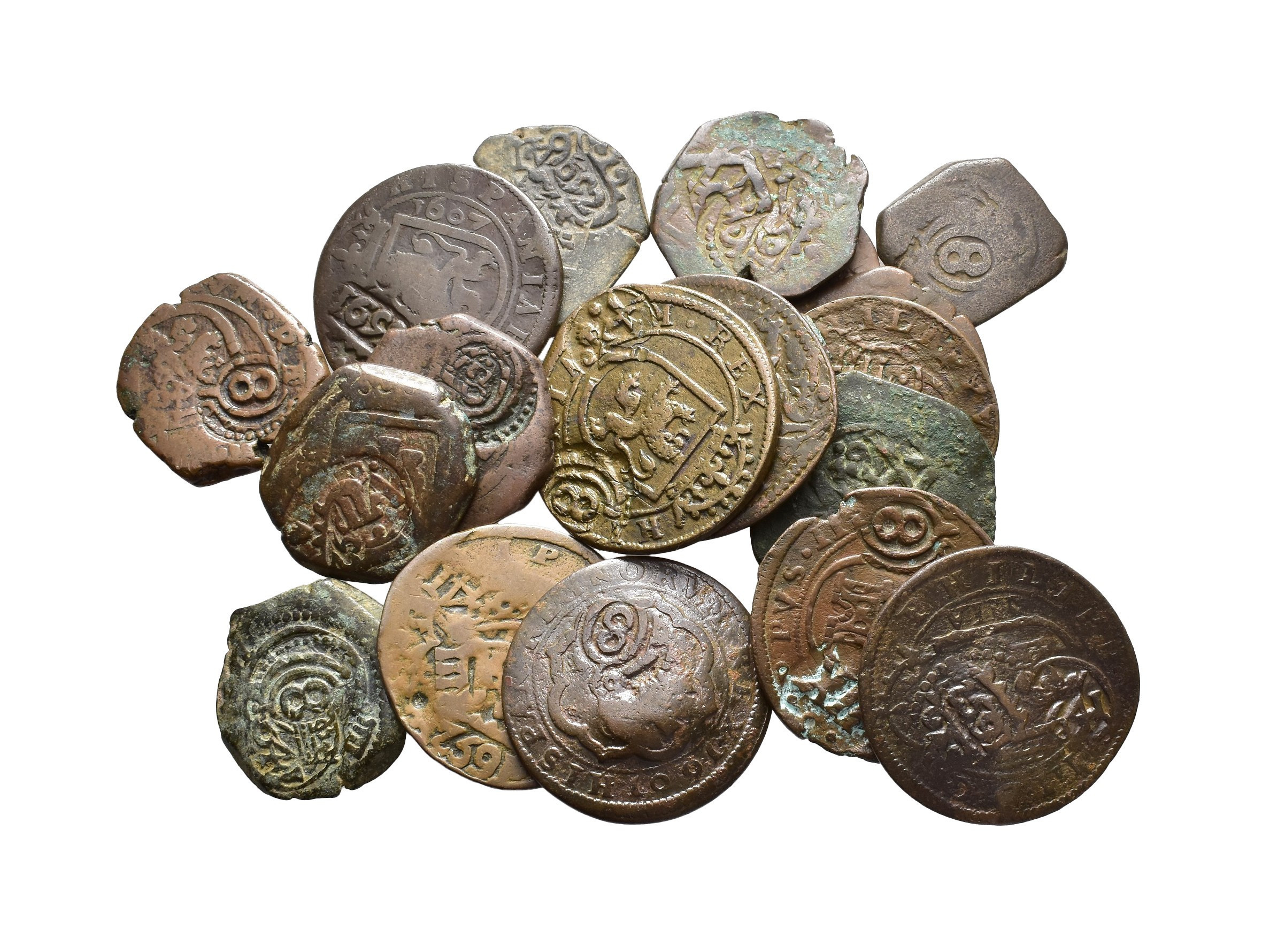 FELIPE IV. Lote de 19 cobres, 8 de Ingenio, con resello 8 maravedís 1652 Coruña con varios resellos. Los resellos BC/MBC.
