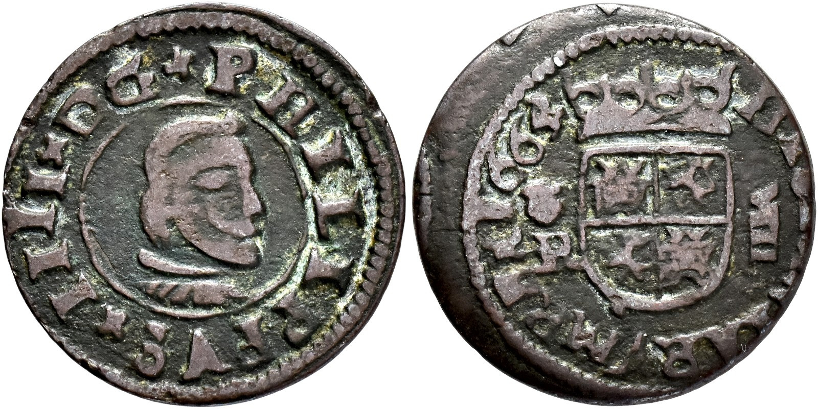 FELIPE IV. 8 maravedís. 1664/3. Coruña. R. CU 2,17 g. 20,9 mm. RS-153 var.; Orol-MO.581. MBC-.