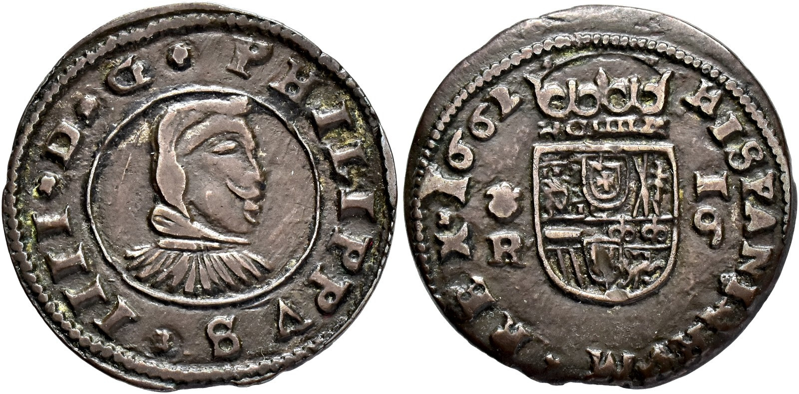 FELIPE IV. 16 maravedís. 1662. Coruña. R. CU 4,07 g. 24,9 mm. RS-132; Orol-MO.449 MBC+.