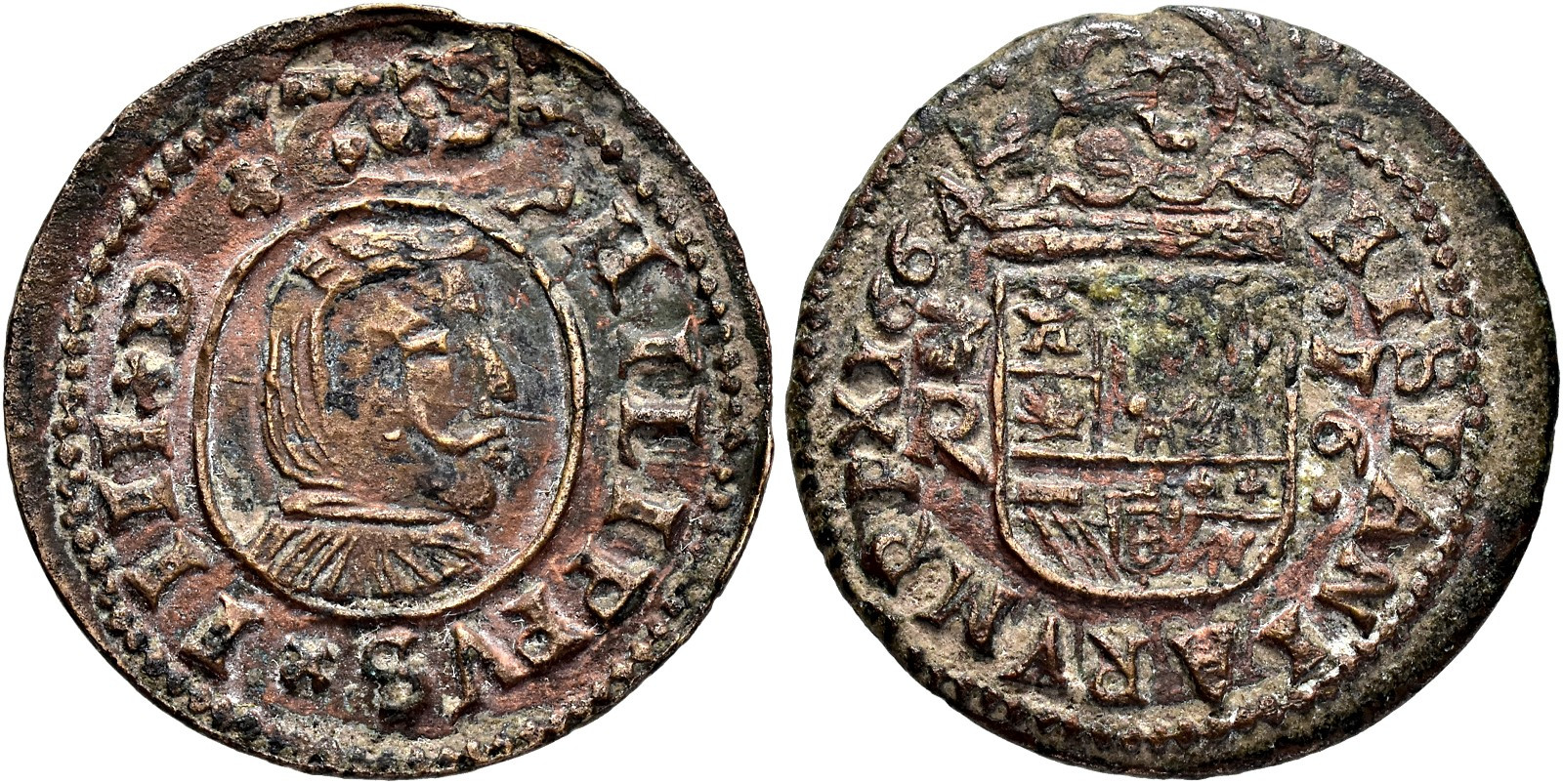FELIPE IV. 16 maravedís. 1664. Coruña. R. Solo el valor entre puntos. Acuñada sobre un cospel resellado con 8 mrs. de 1632. CU 4,28 g. 26 mm. Orol-MO.492. Falsa de época. MBC-. Muy interesante