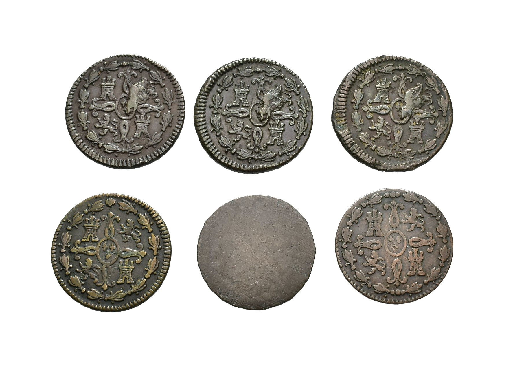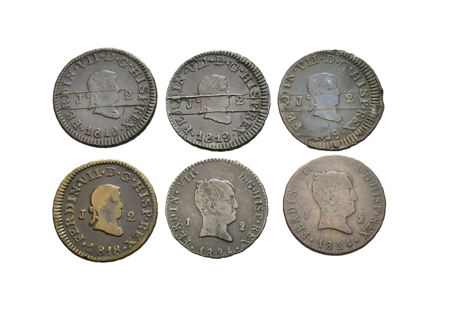 FERNANDO VII. Lote de 6 piezas de 2 maravedís 1818, 1819 (23) con roturas de cuño en anv. y rev. que producen dos rayas paralelas en anv. y rebaba en rev., 1824 con rev. liso por limadura y 1824. Orol-JU.125, 1261, b y c, 127 y 129. BC+/MBC.