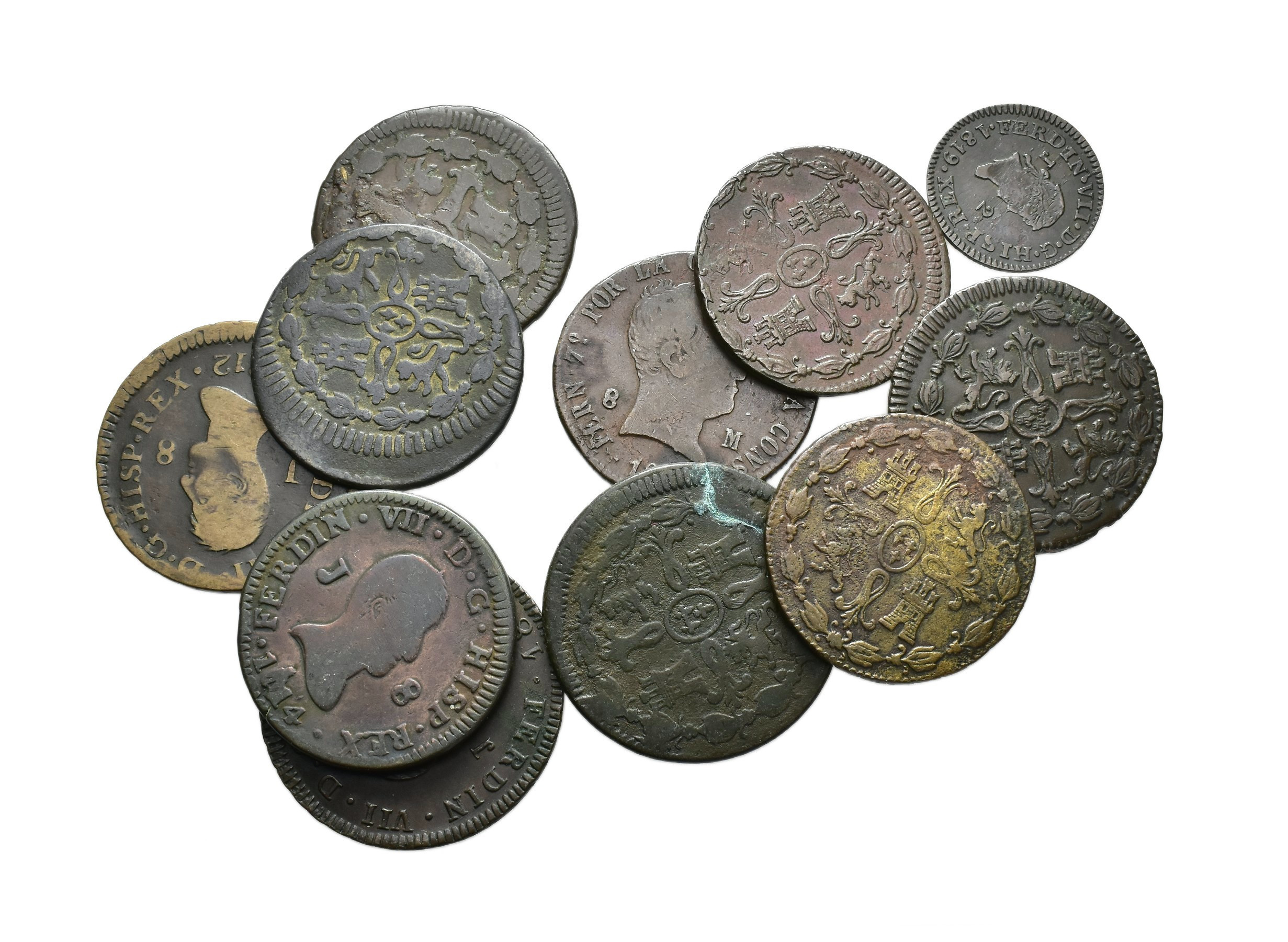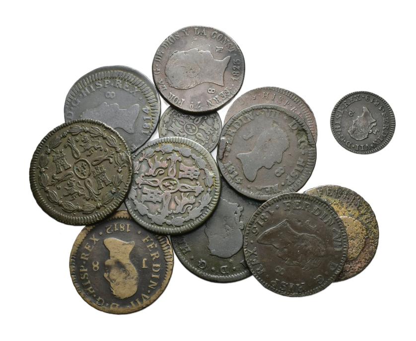 FERNANDO VII. Lote de 12 piezas: 2 de 2 maravedís y 10 de 8 maravedís. OROL-JU.113, 139, 141, 151, 152a, 153, 157, 161 y 165. BC/MBC.