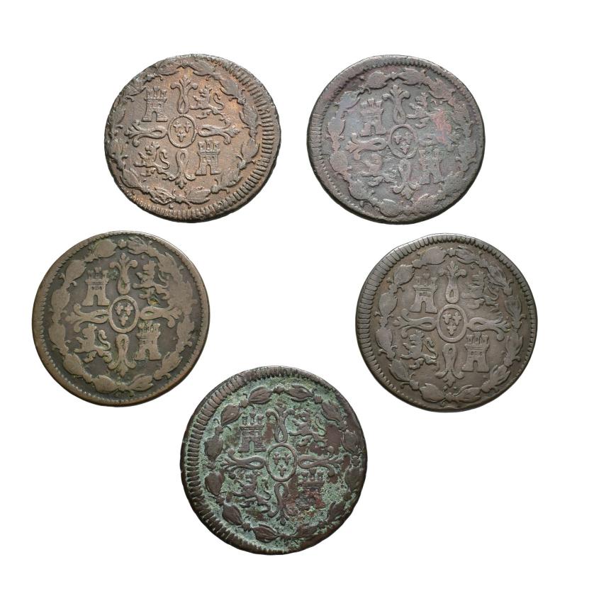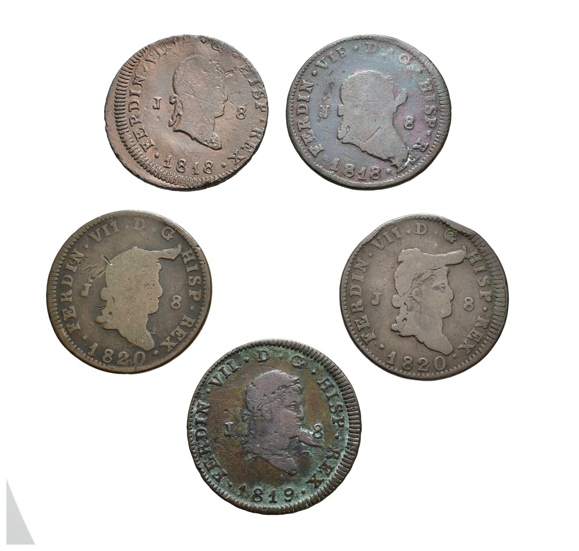 FERNANDO VII. Lote de 5 monedas de 8 maravedís, Jubia, con defectos de acuñación, rebabas por rotura de cuño o descentrada. Orol-JU-115a,b, 155, 156 y 167. BC+/MBC.