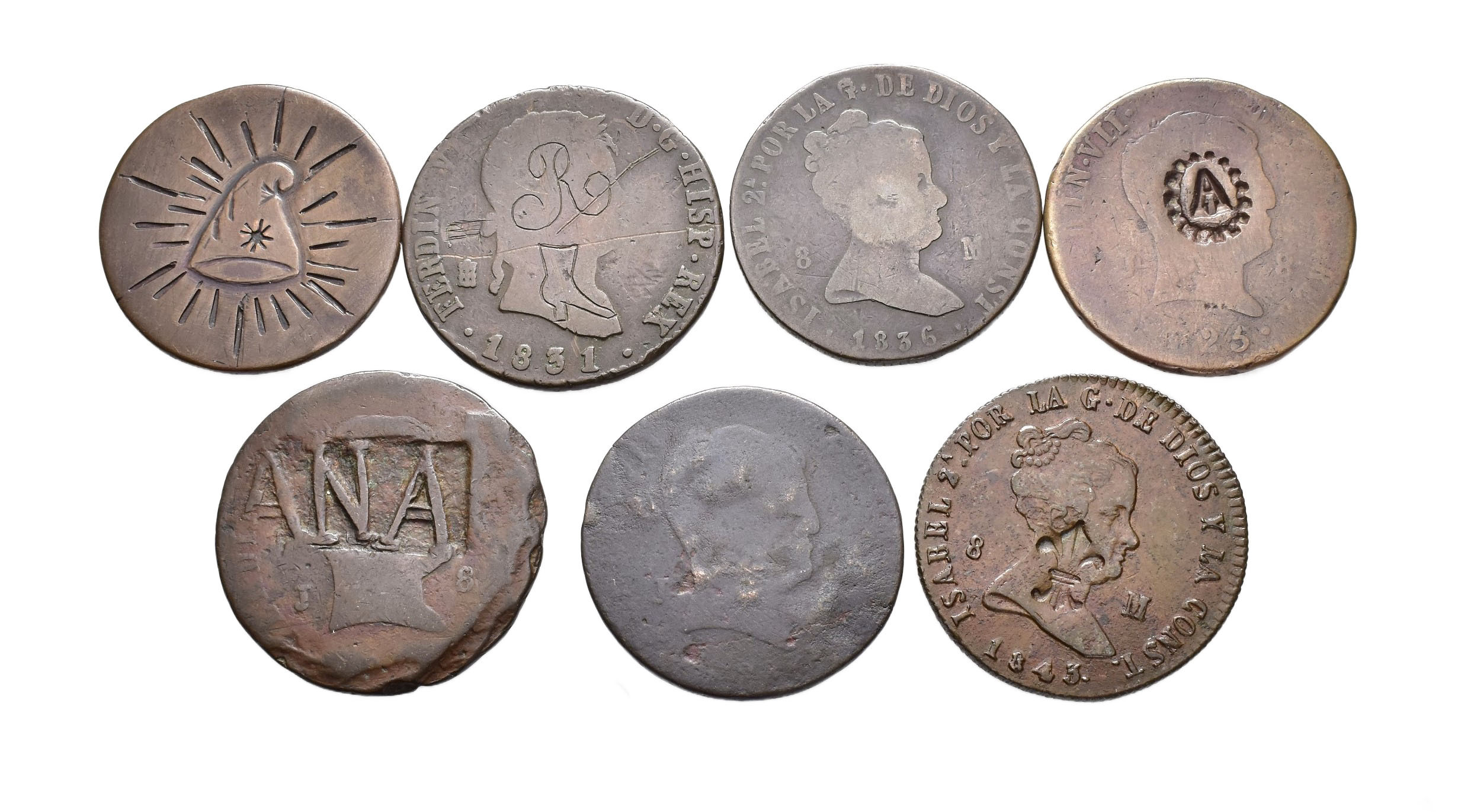 FERNANDO VII. Lote de 7 contramarcas de varios tipos sobre 8 maravedís de Fernando VII e Isabel II. Orol-CO.6, 14, 16, 29, 30, 51 y 52. Las contramarcas MBC.