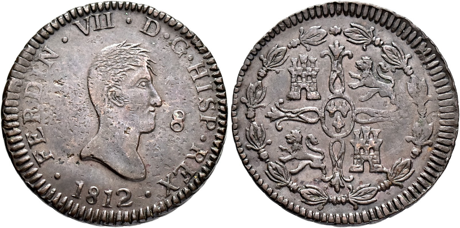 FERNANDO VII. 8 maravedís. 1812. Jubia. Marca de ceca poco visible. CU 10,8 g. 30,3 mm. VI-199; AC-190; Orol-JU.152b Hojitas y vanos. MBC. Muy escasa.
