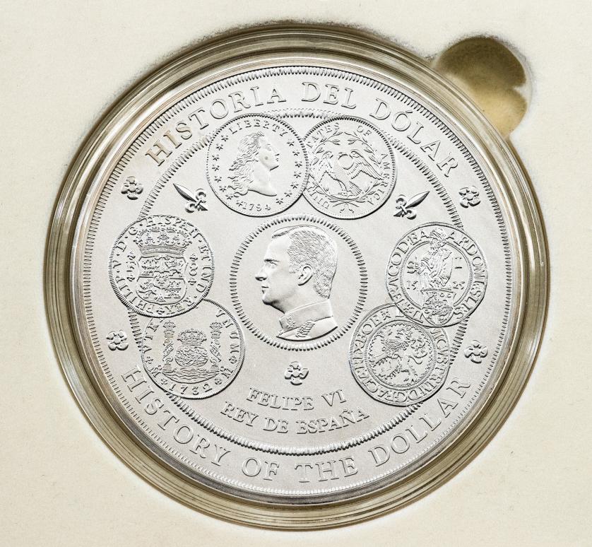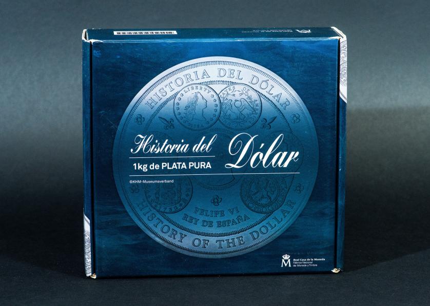 FELIPE VI. Estuche FNMT. Historia del dólar. 2017. 300 euros conmemorativos, 1 kilo de plata pura. SC mate. En su estuche y con certificado.