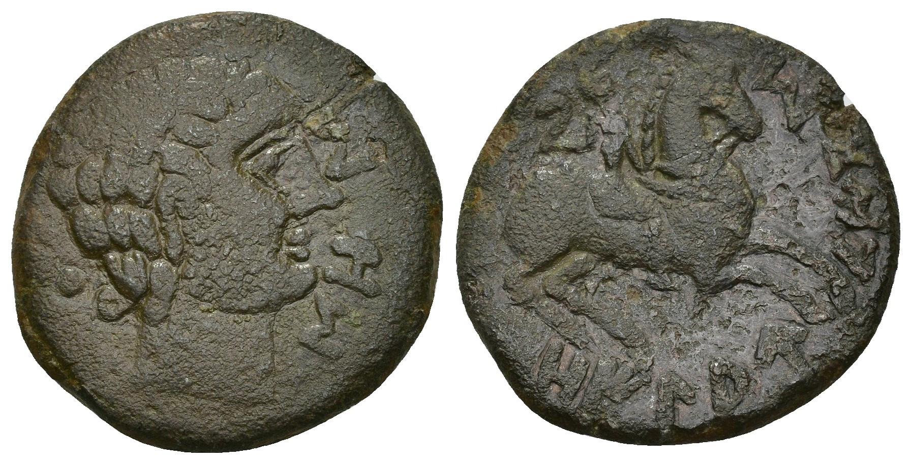 HISPANIA ANTIGUA. OILAUNIKOS. Unidad. A/ Cabeza masculina a der., delante signos ibéricos SOS, detrás glóbulo. R/ Jinete con hoz de guerra a der., debajo OILAUNIKoS. AE 16,20 mm. 29,78 mm. I-1861. ACIP-1795. Campo del rev. repasado. BC+. Ex Áureo, 29-9-1992, lote 288.