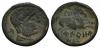 HISPANIA ANTIGUA. UIROUIAS. Unidad. A/ Cabeza masculina a der., detrás signo ibérico U. R/ Jinete lancero a der., debajo UIROU/IA sin línea. AE 11,05 g. 25 mm. I-2482. ACIP-1924. Pátina oscura rugosa. MBC-/BC+. Muy rara.
