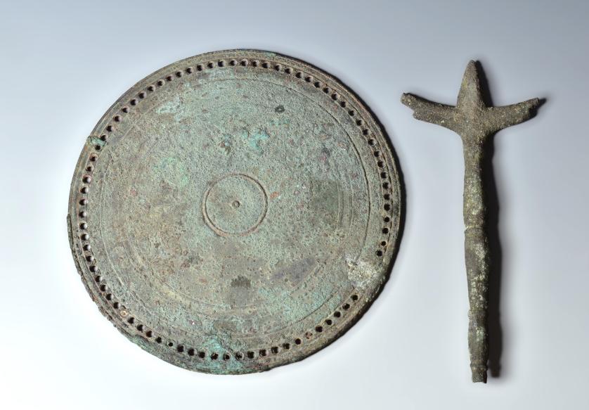 ARQUEOLOGÍA. ROMA. Imperio Romano. Espejo con mango original (ss. I a.C.- IV d.C.). Decoración orla de pequeños círculos perforados. Bronce. Mango despegado. Diámetro 11 cm. Longitud 10,7 cm.