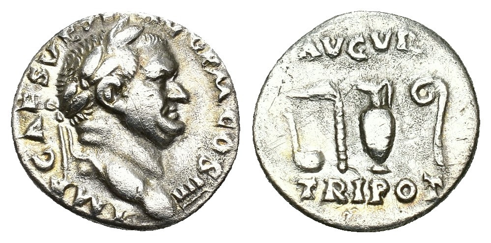 IMPERIO ROMANO. VESPASIANO. Denario. Roma (72-73 d.C.). A/ Cabeza laureada a der.; IMP CAES VESP AVG P M COS IIII. R/ Instrumentos sacerdotales; AVGVR/TRI POT. AR 3,12 g. 17,2 mm. RIC-356. MBC.