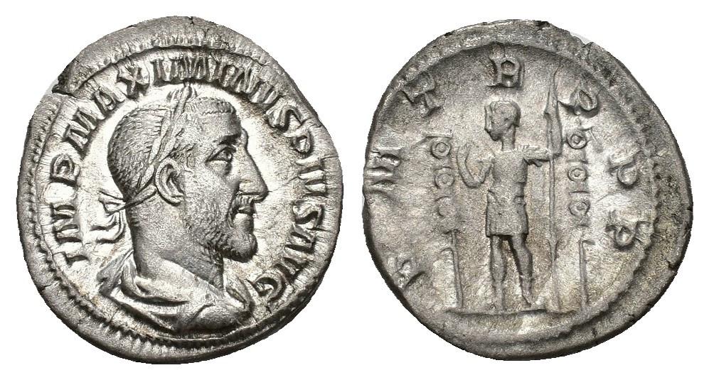 IMPERIO ROMANO. MAXIMINO I. Denario. Roma (235). A/ Busto laureado, drapeado y acorazado a der.; IMP MAXIMINVS PIVS AVG. R/ El emperador en traje militar con dos estandartes; P M TR P P P. AR 3,18 g. 19,1 mm. RIC-1. MBC/MBC-.
