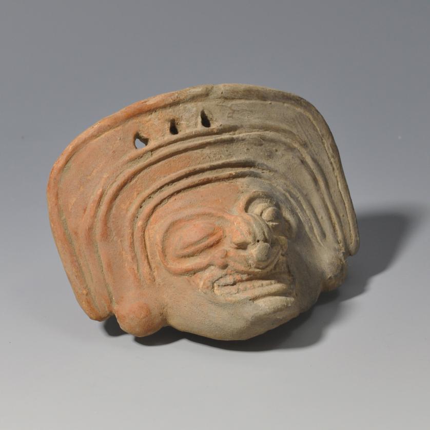 ARQUEOLOGÍA. PREHISPÁNICO. Cultura Jama Coaque. Máscara con nariguera y tocado (500-1000 d.C.). Cerámica. Longitud 12 cm. Adjunta certificado de exportación de Alemania. Adjunta declaración de importación del Ministerio de Cultura de España (no sujeto a tasas de exportación). Ex colección Westfalia (1970).
