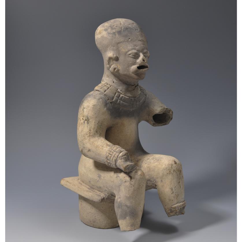 ARQUEOLOGÍA. PREHISPÁNICO. Cultura La Tolita. Figura sentada (200 a.C.-700 d.C.). Cerámica. Altura 27,5 cm. Fragmentada y con faltas. Referencia de catalogación antigua en su parte posterior. Ex colección Barón Howard Strouth.