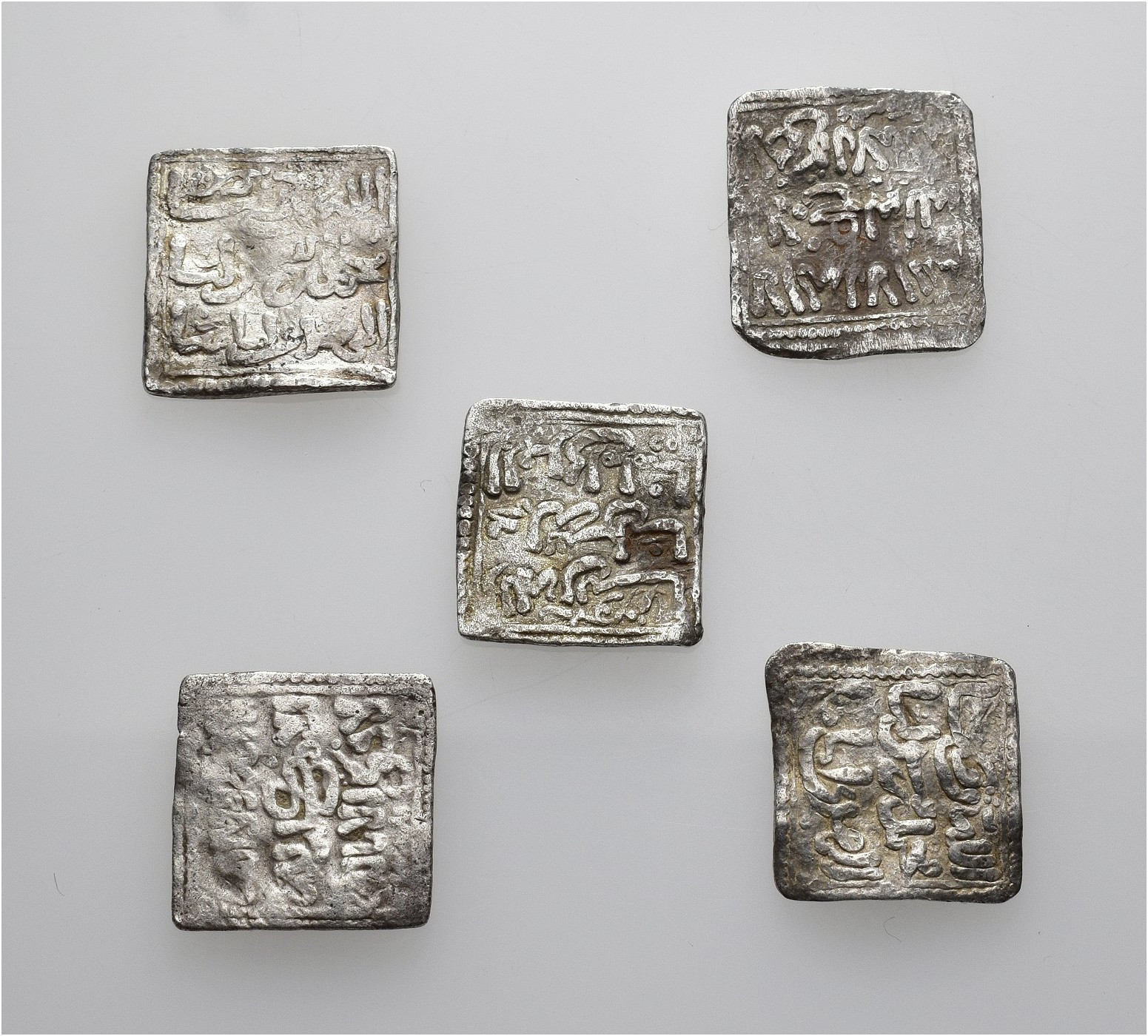 ACUÑACIONES HISPANO-ÁRABES. ALMOHADES. Lote de 5 dirhams: Fez (2), Segilmesa (1), borrosas (2). BC+/MBC-.