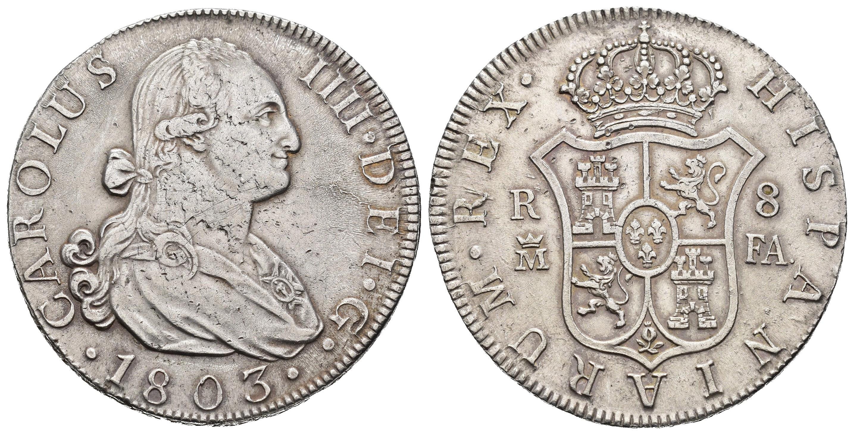 CARLOS IV. 8 reales. 1803. Madrid. FA. AR 27,47 g. 39,61 mm. VI-778. Plata agria en anv. MBC/MBC+. Muy escasa.