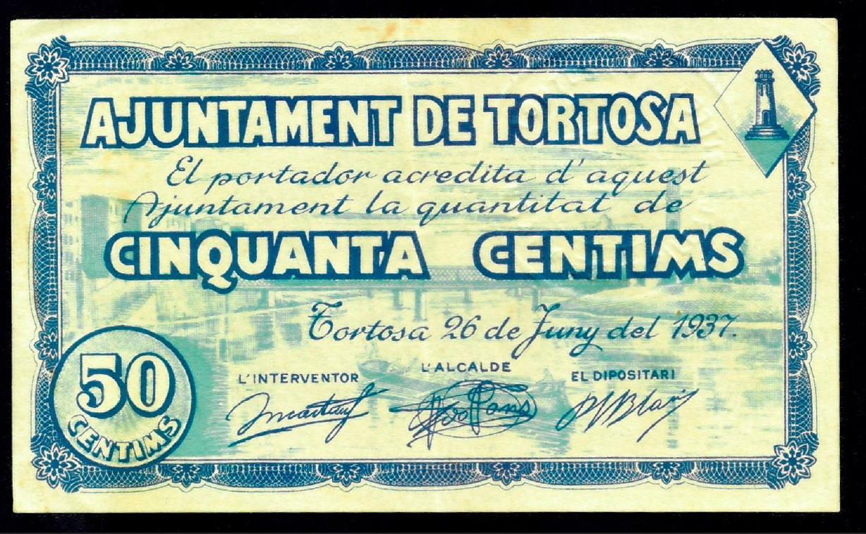 BILLETES LOCALES. GUERRA CIVIL. 50 céntimos. 1937. Ayuntamiento de Tortosa. Turró-2579. MBC+.