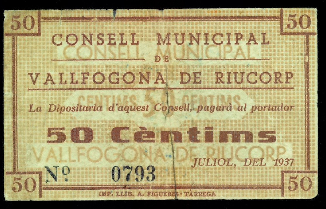 BILLETES LOCALES. GUERRA CIVIL. 50 céntimos. 1937. Consejo Municipal de Vallfogona de Riucorp. Turró-2667. MBC.