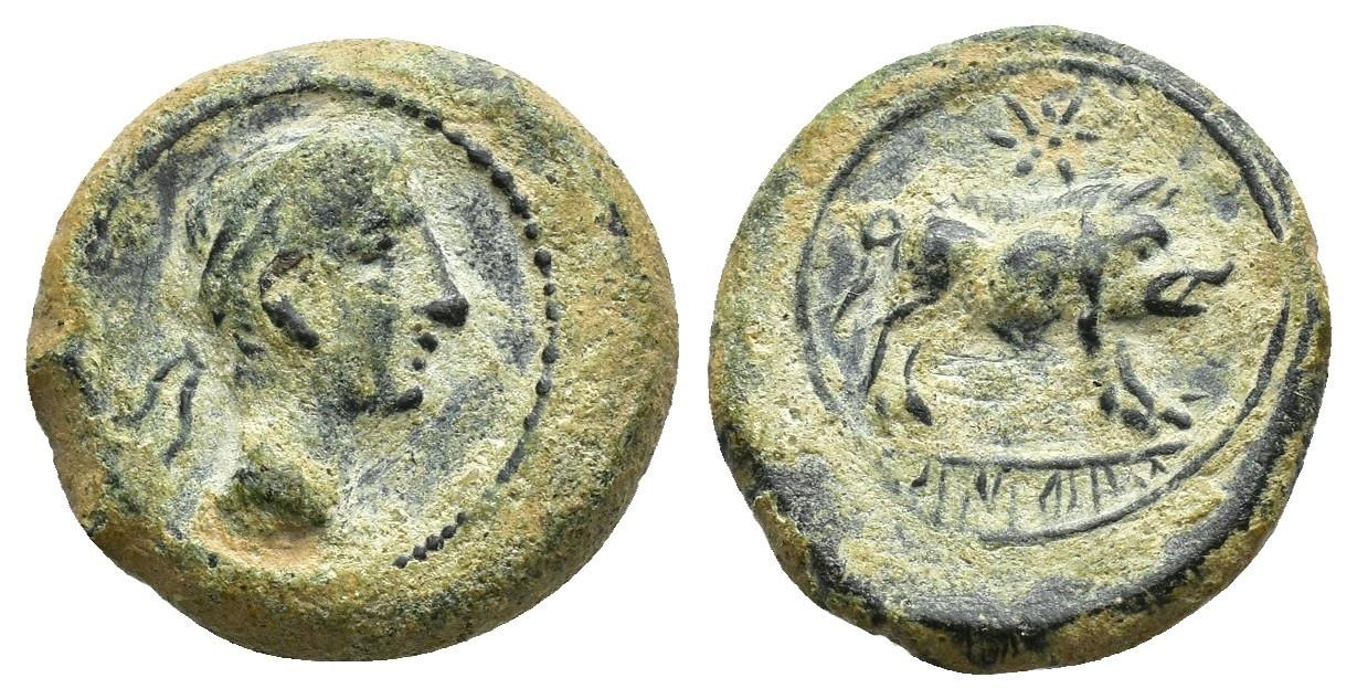 HISPANIA ANTIGUA. KASTILO-CASTULO. Cuadrante. A/ Cabeza masculina diadema con ínfulas a der. R/ Jabalí a der., encima estrella, en exergo KaSTiLO. AE 3,93 g. 16,22 mm. I-735 var. ACIP-2152. Pátina verde terrosa. MBC.