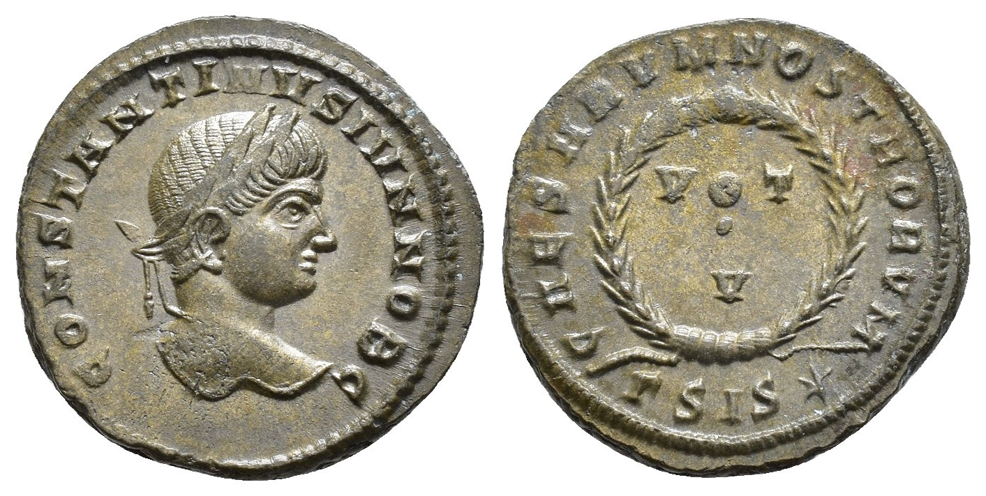 IMPERIO ROMANO. CONSTANTINO II. Follis. Siscia. A/ Cabeza laureada a der.; CONSTANTINVS IVN NOB C. R/ Láurea rodeando VOT/V; CAESARVM NOSTRORVM. -/-//GSIS*. AE 3,41 g. 18,9 mm. RIC-163. EBC+.