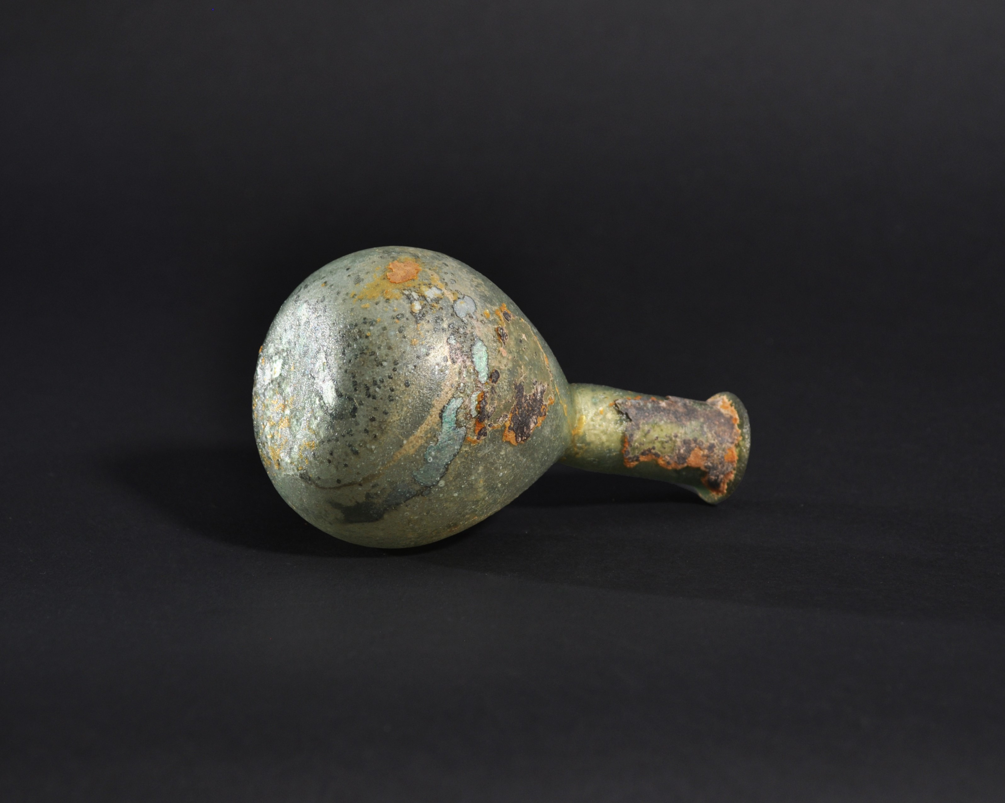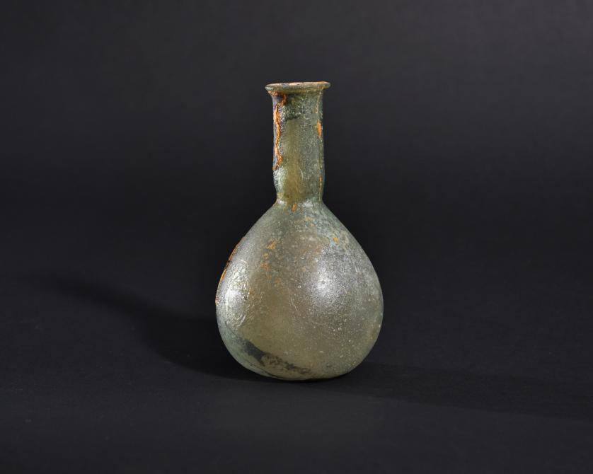 ARQUEOLOGÍA. ROMA. Ungüentario con cuerpo globular y boca exvasada (ss. I-IV d.C.). Vidrio. Altura 12 cm.