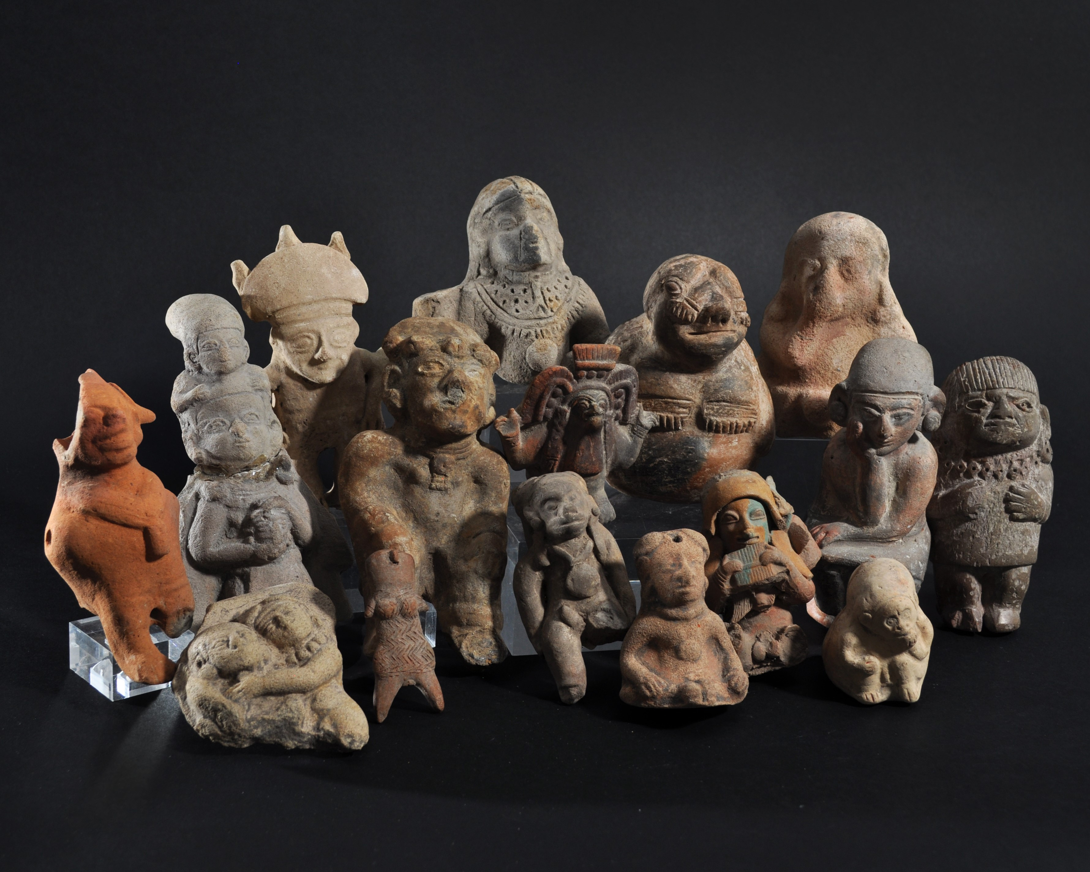 ARQUEOLOGÍA. PREHISPÁNICO. Lote de 16 figuras. Diferentes épocas y culturas. Cerámica. Altura de 5,5 a 14,5 cm. Fragmentadas, restauradas, con faltas y restos de adhesivos.