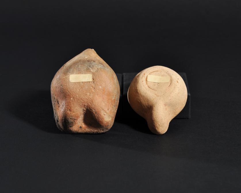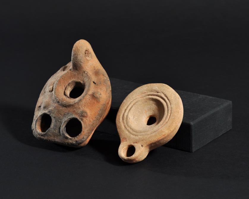 ARQUEOLOGÍA. ROMA. Lote de 2 lucernas, una de ellas con doble piquera (ss. I-IV d.C.). Terracota. Longitud de 6,7 a 8,6 cm. Restaurada.