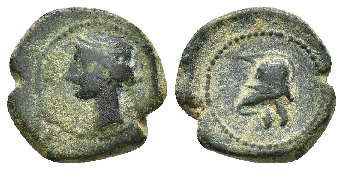 HISPANIA ANTIGUA. EMISIONES HISPANO-CARTAGINESAS. Cuarto. A/ Cabeza de Tanit a izq. R/ Casco a izq. AE 2,65 g. 14 mm. I-521; ACIP-583. Cospel abierto. Pátina oscura. MBC-/MBC. Muy rara.