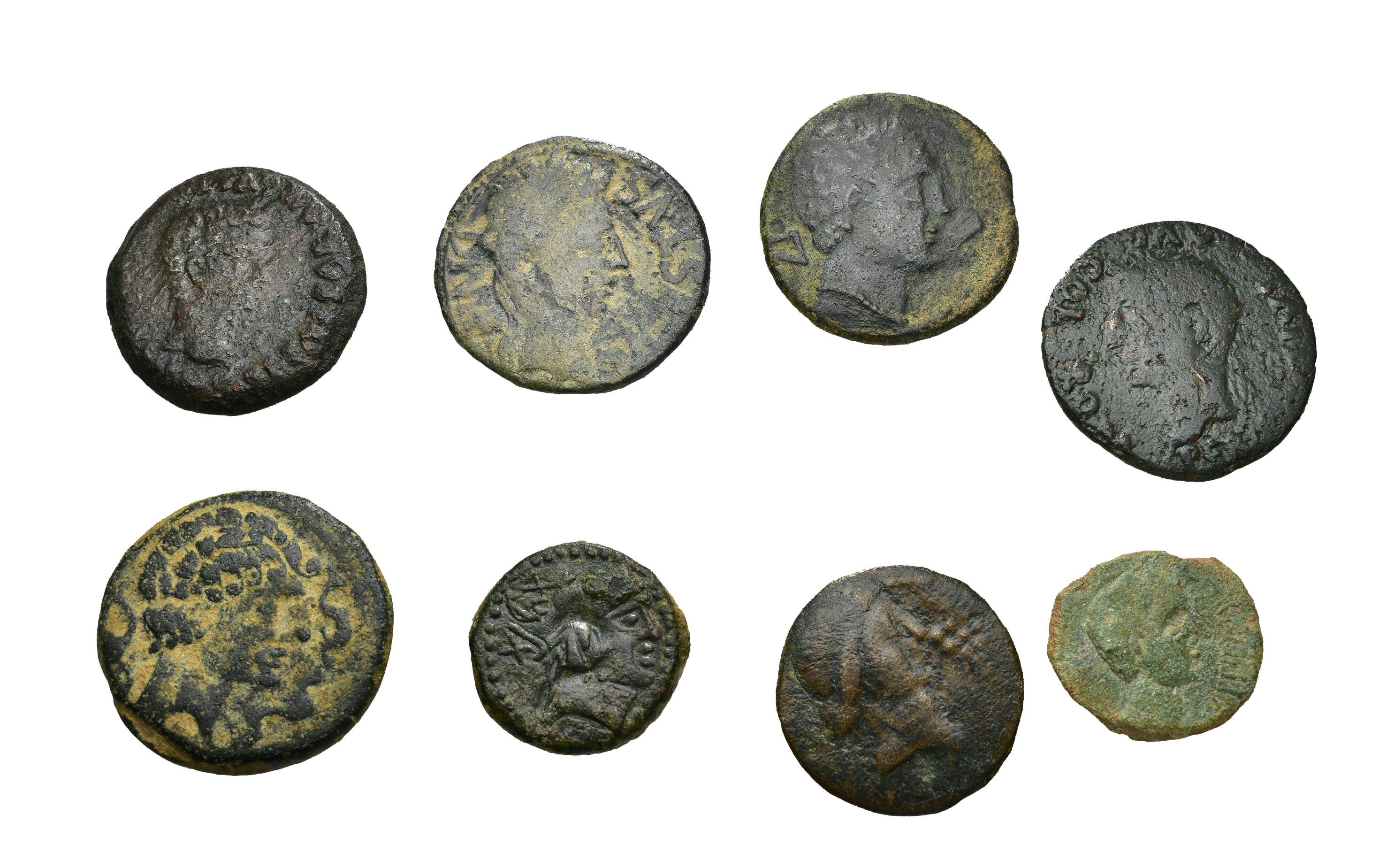 HISPANIA ANTIGUA. Lote de 8 piezas: 4 unidades ibéricas y 1 semis y tres ases hispano-romanos. RC/MBC-.