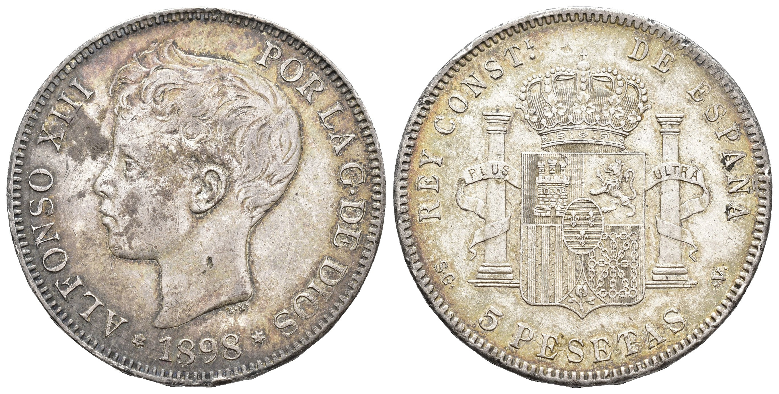ALFONSO XIII. 5 pesetas. 1898*18- Madrid. SGV. AR 25,06 g. 37,3 mm. VII-190; AC-109? Pequeñas marcas y hojitas en rev. MBC.