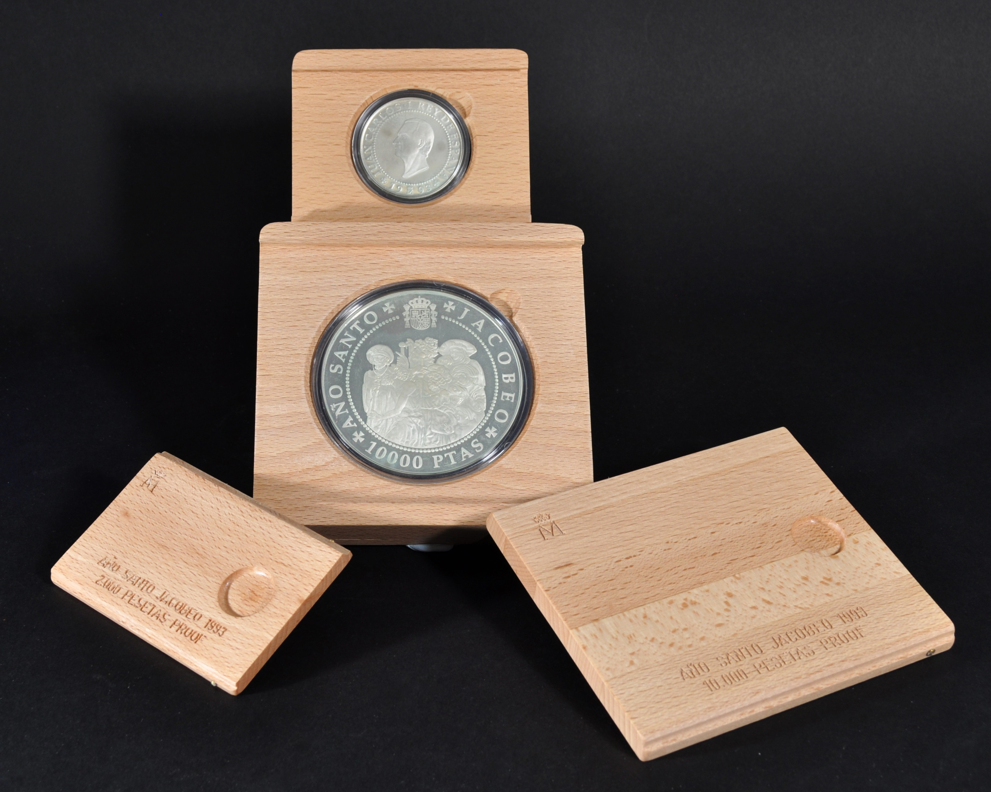 JUAN CARLOS I. Lote de 2 estuches conmemorativos FNMT Año Santo Jacobeo 1993: 2000 pts. (8 reales, AR 27 g) Cruz de Santiago y Venera, y 10000 pts. (cincuentín, AR 168,75 g), Peregrinos época medieval. Proof. Con certificados.